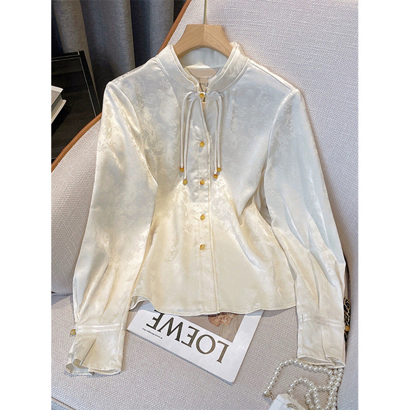 Denne eksklusive dameskjorte skiller sig ud med sit elegante design og høj kvalitet. Fremstillet af et luksuriøst, skinnende stof tilbyder den både komfort og stil. Den høje krave giver blusen et klassisk præg, mens de dekorative knapper og de fine detaljer fuldender helheden.