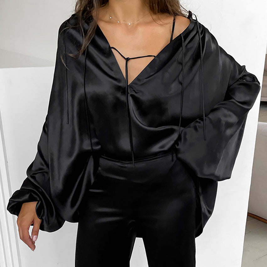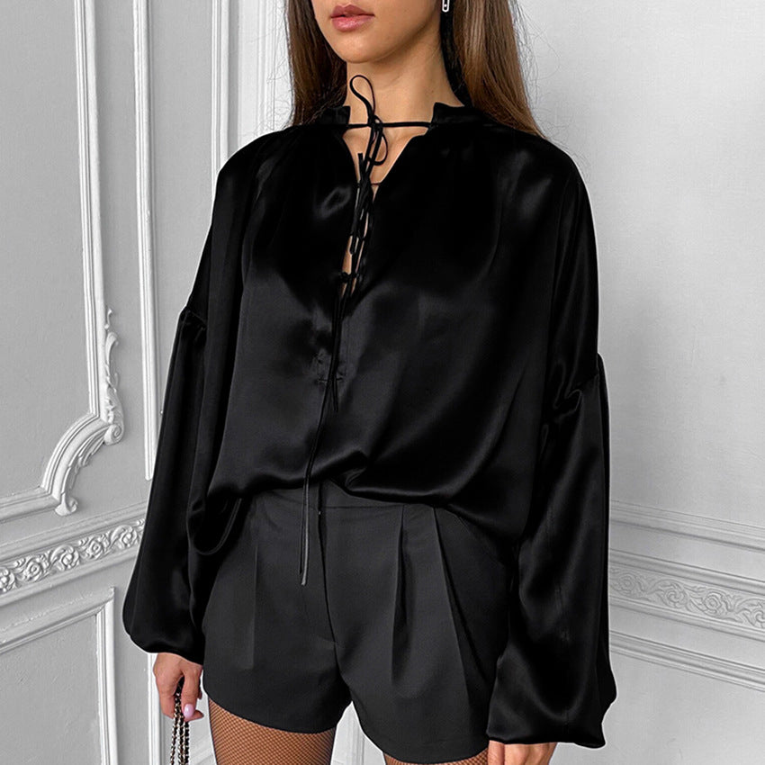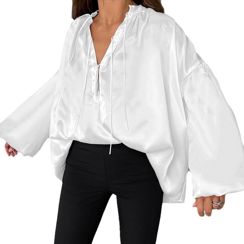 Oplev den elegante dameskjorte med stilfuld bindebånd og vide ærmer fra Stilla. Denne stilfulde skjorte er fremstillet af høj kvalitets satin, hvilket giver en luksuriøs glans og en behagelig bæreoplevelse. Den løse pasform og de vide ærmer sikrer maksimal komfort og bevægelsesfrihed.