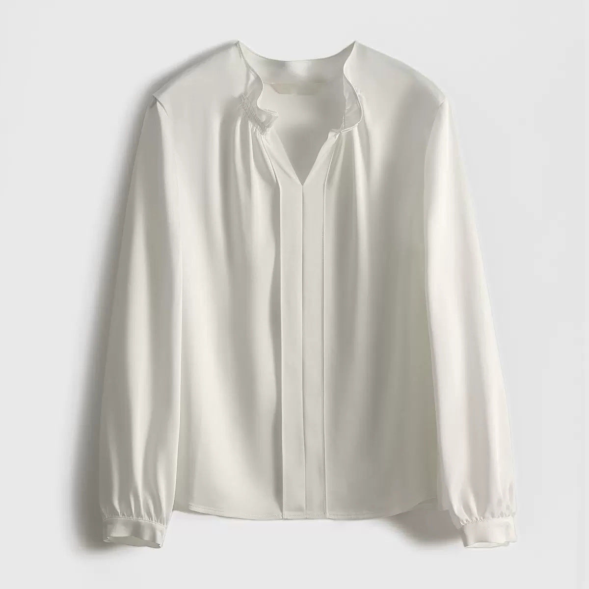 Opdag vores eksklusive elegante bluse, der med sin moderne ståkrave og stilfulde flæsedetaljer både tilbyder et klassisk og samtidig tidssvarende look. Denne bluse er lavet af højkvalitets, flydende materiale, der ikke kun sikrer optimal bærekomfort, men også skaber en elegant silhuet.