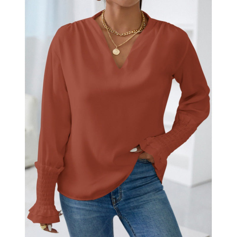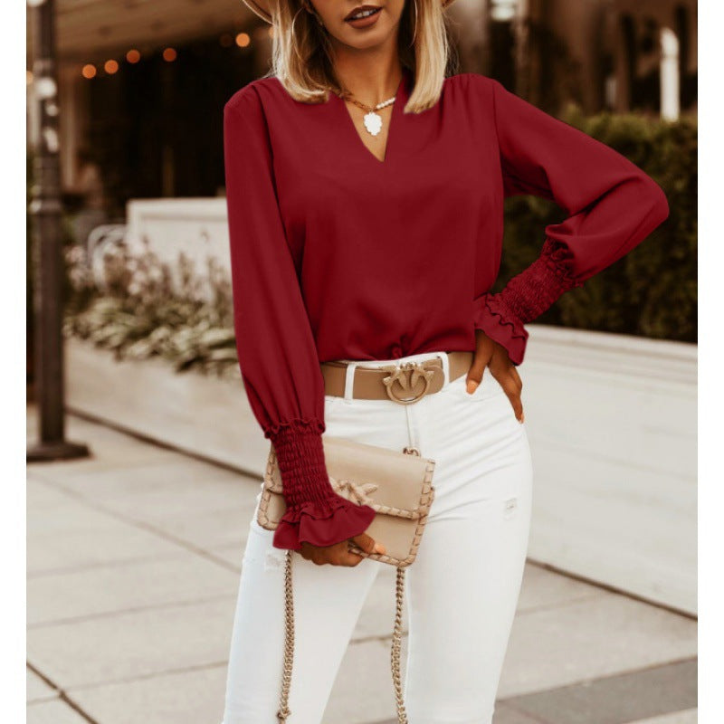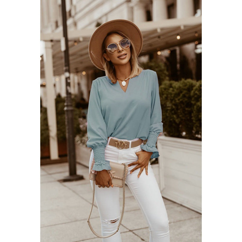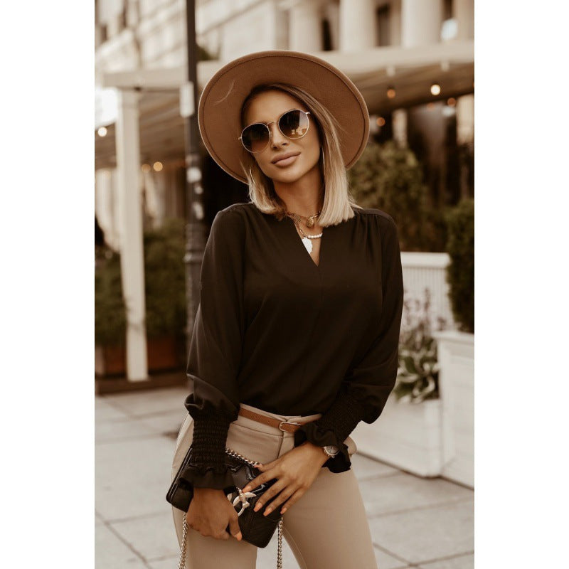 Opdag den ønskede blanding af stil og komfort med vores elegante bluse, der er designet med en moderne V-hals og betagende flæsedetaljer. Denne bluse er ideel til enhver lejlighed, hvad enten det er på kontoret eller til en festlig middag.
