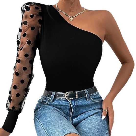 Denne stilfulde bodystocking er et must-have for modebevidste damer, der ønsker at understrege deres personlige stil. Med et unikt asymmetrisk snit og en spændende puffærme i gennemsigtigt materiale er denne top både chic og forførende.
