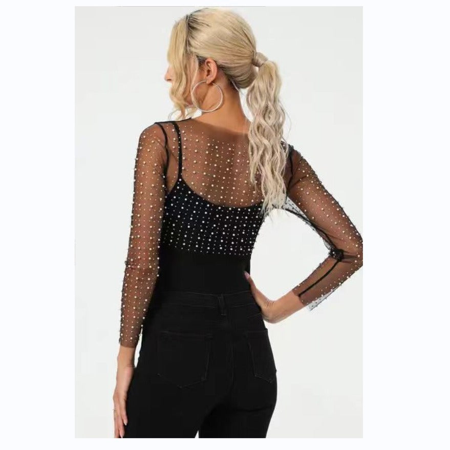 Opdag vores elegante bodysuit til damer med gennemsigtige ærmer og funkende detaljer, der tilbyder den perfekte kombination af stil og komfort. Denne fashionable bodysuit er lavet af materialer af høj kvalitet og er ideel til forskellige anledninger, hvad enten det er en nat i klubben eller en elegant fest.