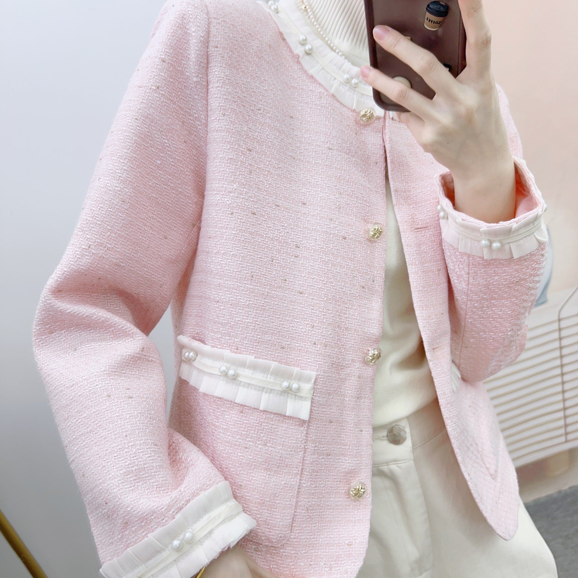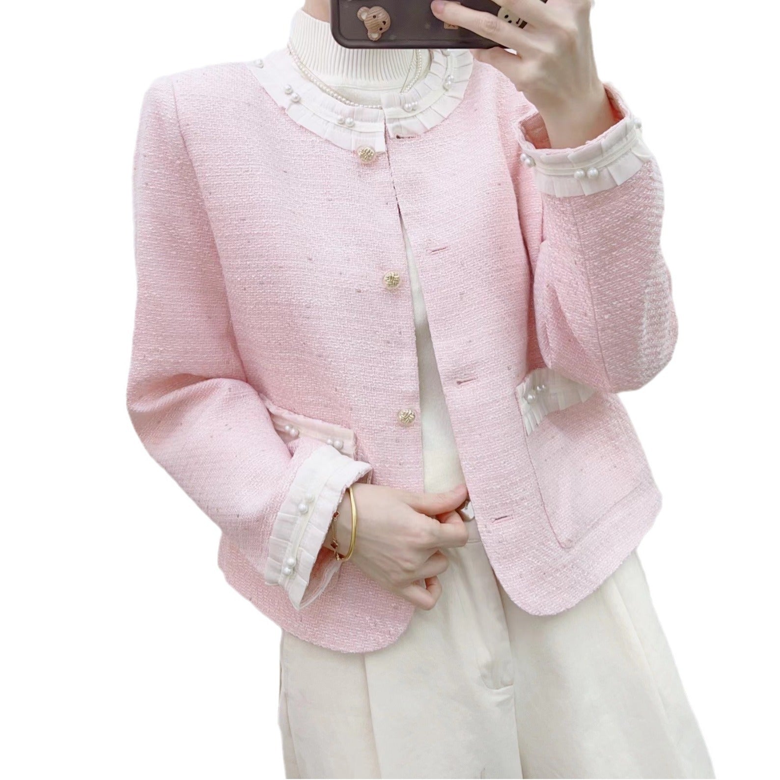 Oplev vores elegante bouclé-jakke til kvinder med dekorative perleknapper og struktureret design – et absolut must-have for modebevidste kvinder!