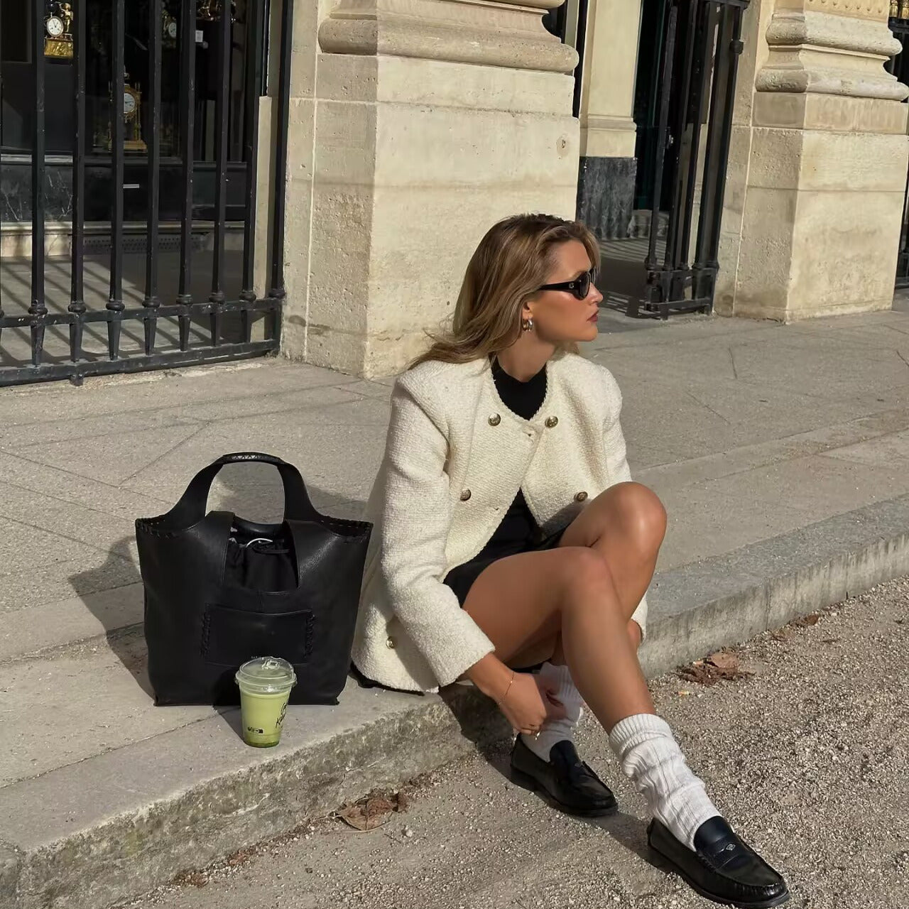 Denne elegante Boucle-jakke fra Stilla forener stil og funktionalitet på perfekt vis. Med sit fashionable design og de gyldne knapper er den en stilfuld følgesvend til enhver lejlighed.