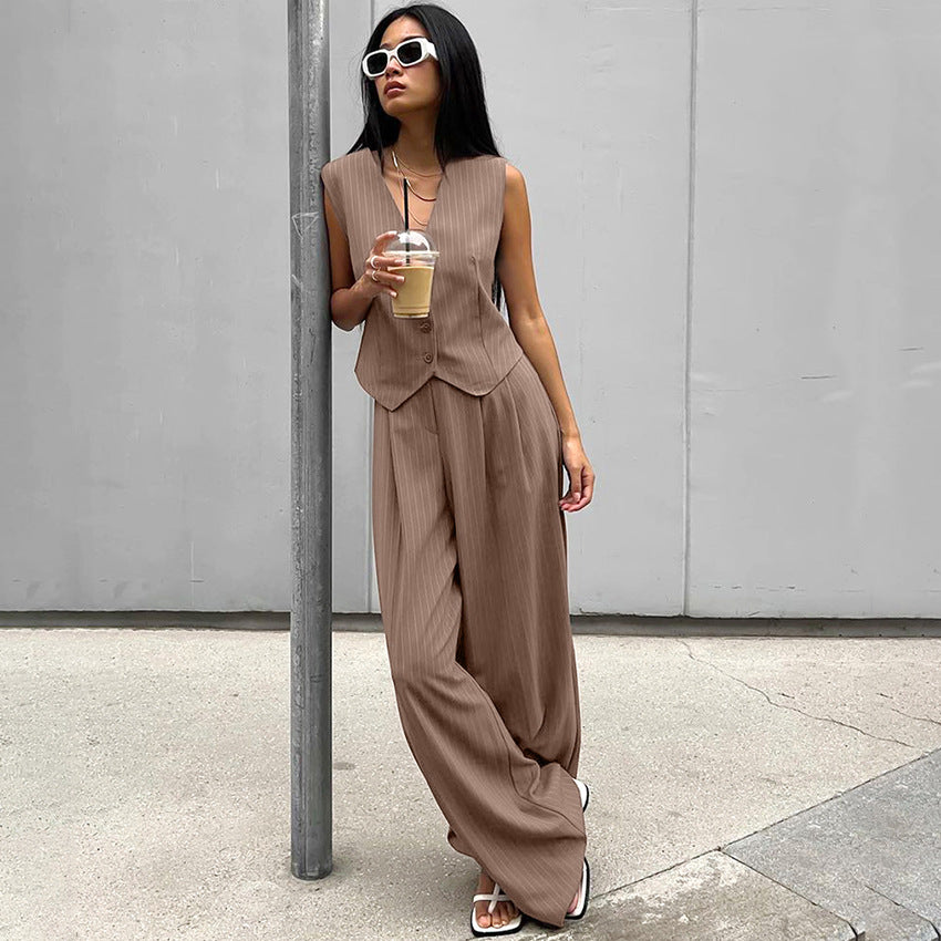 Vores fantastiske elegante buksedragt kombinerer stil og komfort på perfekt vis. Den ærmeløse blazer lavet af kvalitetsmateriale giver en chic silhuet, mens de løse bukser giver maksimal bevægelsesfrihed.