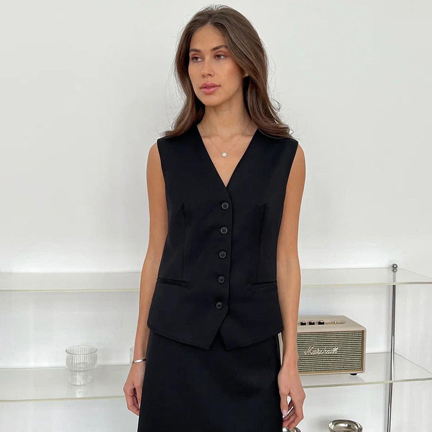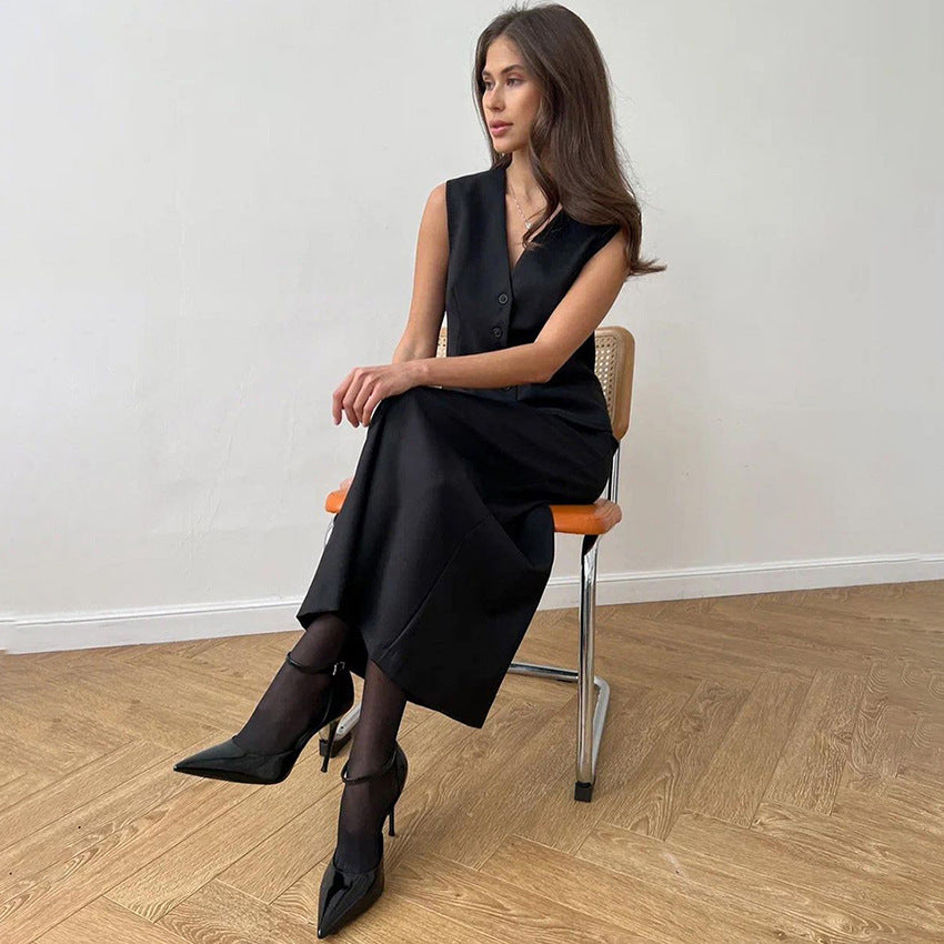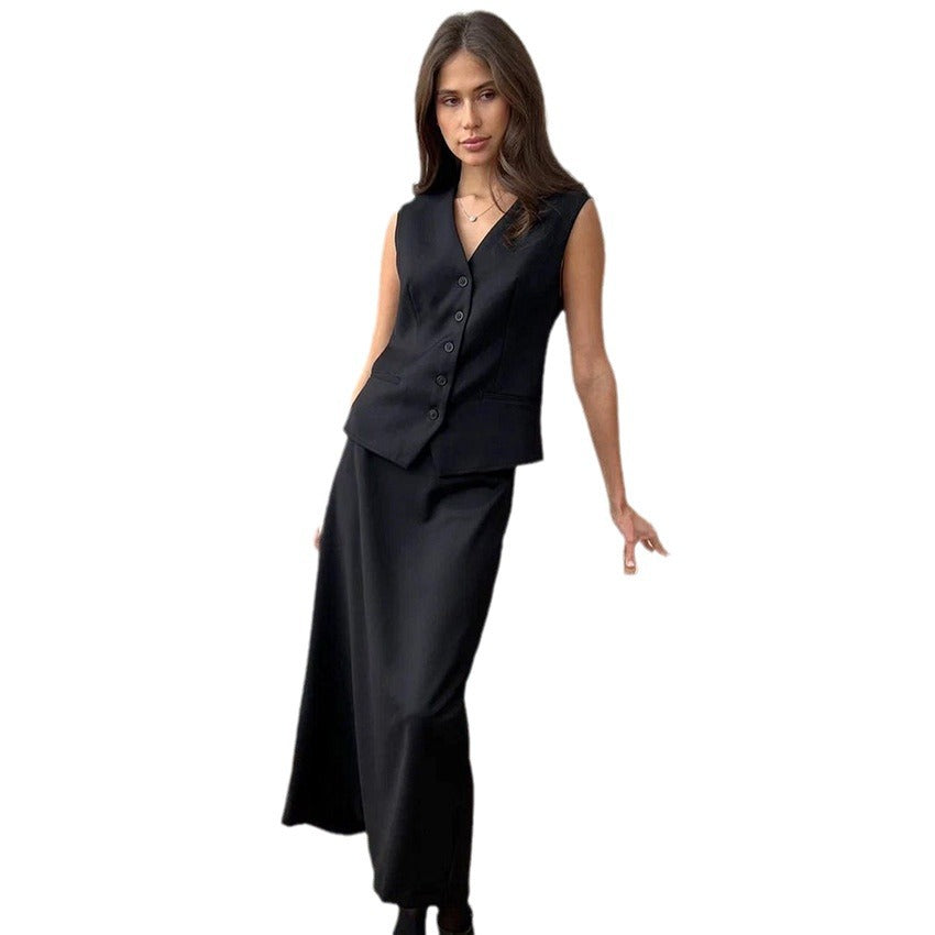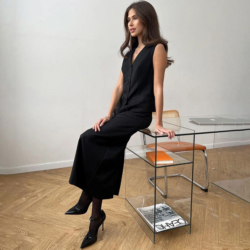 Opdag vores innovative buksedragt-sæt, der perfekt kombinerer stil og elegance. Denne alsidige kombination af en figursyet vest og en svævende nederdel skaber et fascinerende look, ideelt til både formelle anledninger og hverdagsbrug.
