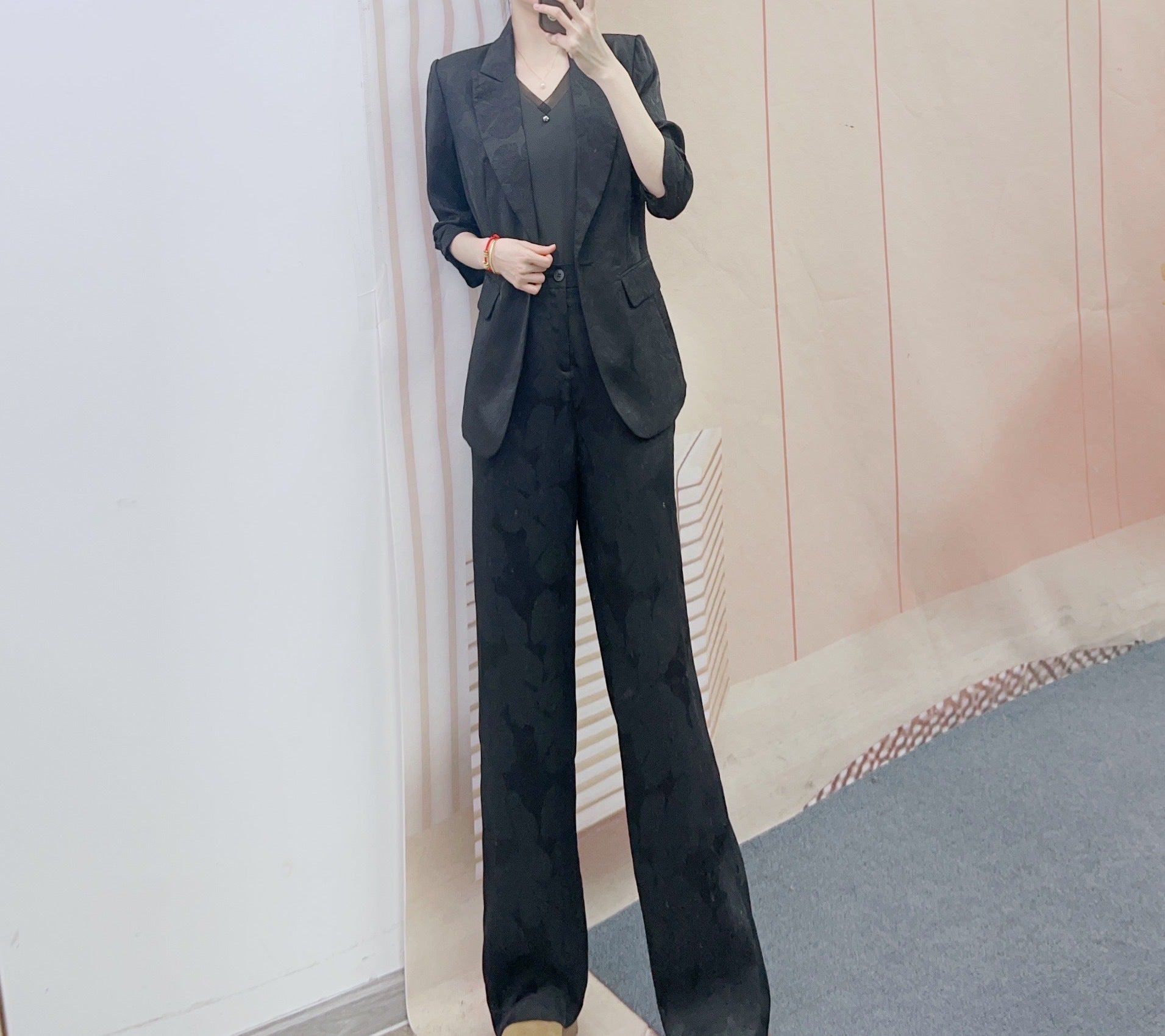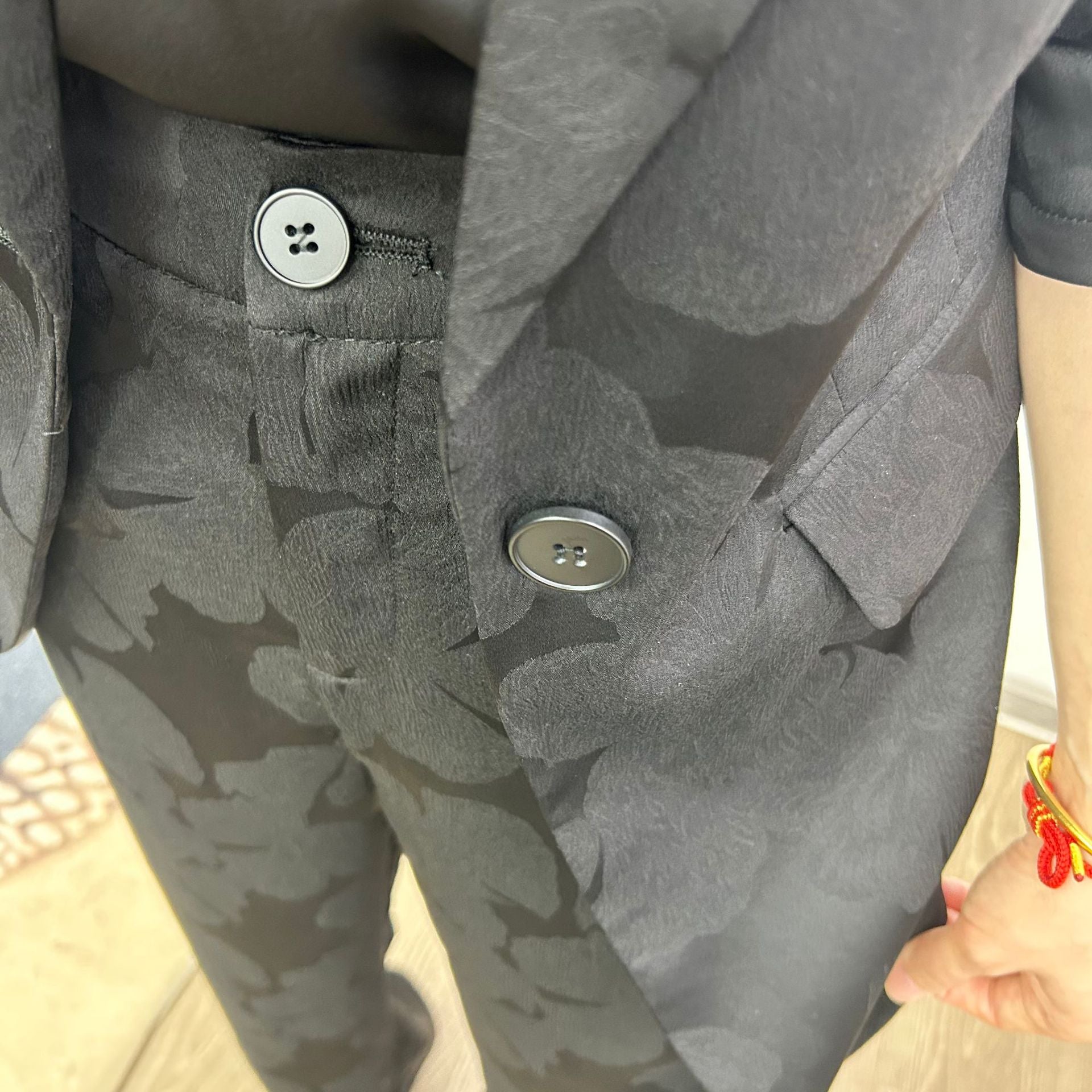 Fremstillet af materialer af høj kvalitet, tilbyder dette jakkesæt en behagelig bærekomfort og er ideelt til kontor, møder eller forretningsarrangementer. Det enkle, men smagfulde design med fine detaljer gør det til en tidløs følgesvend i din garderobe.