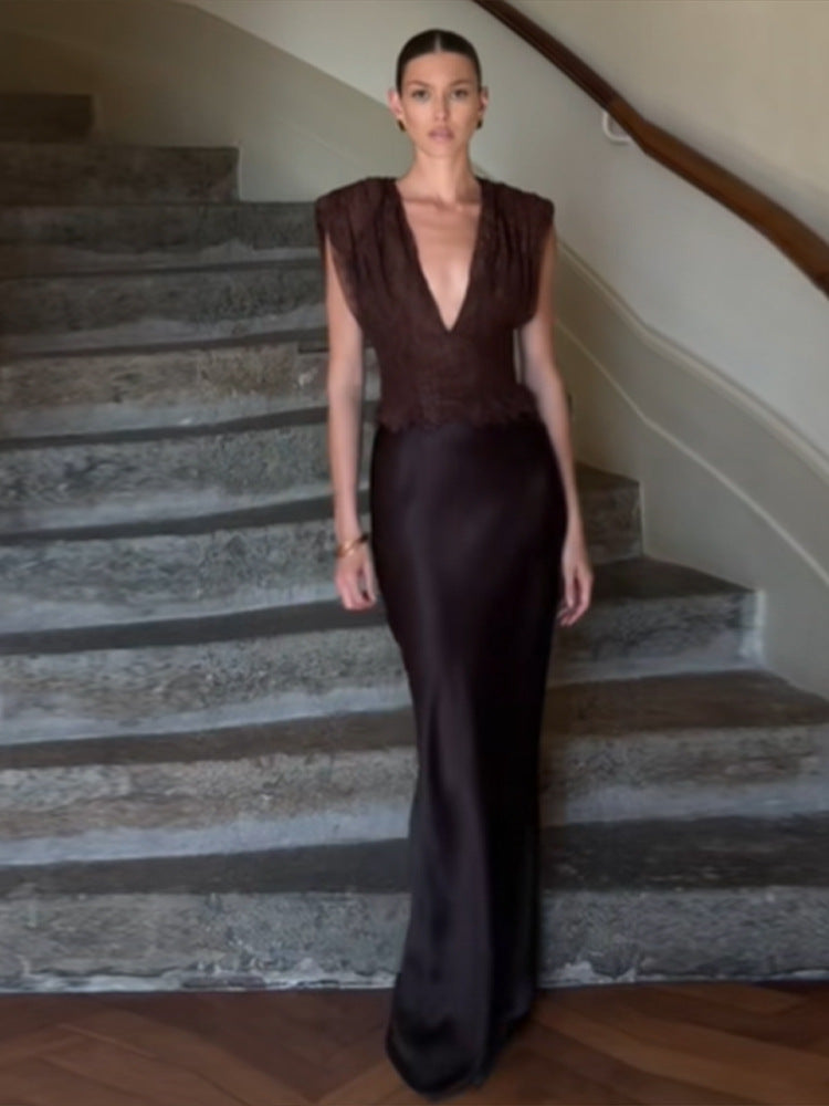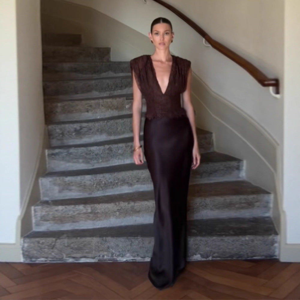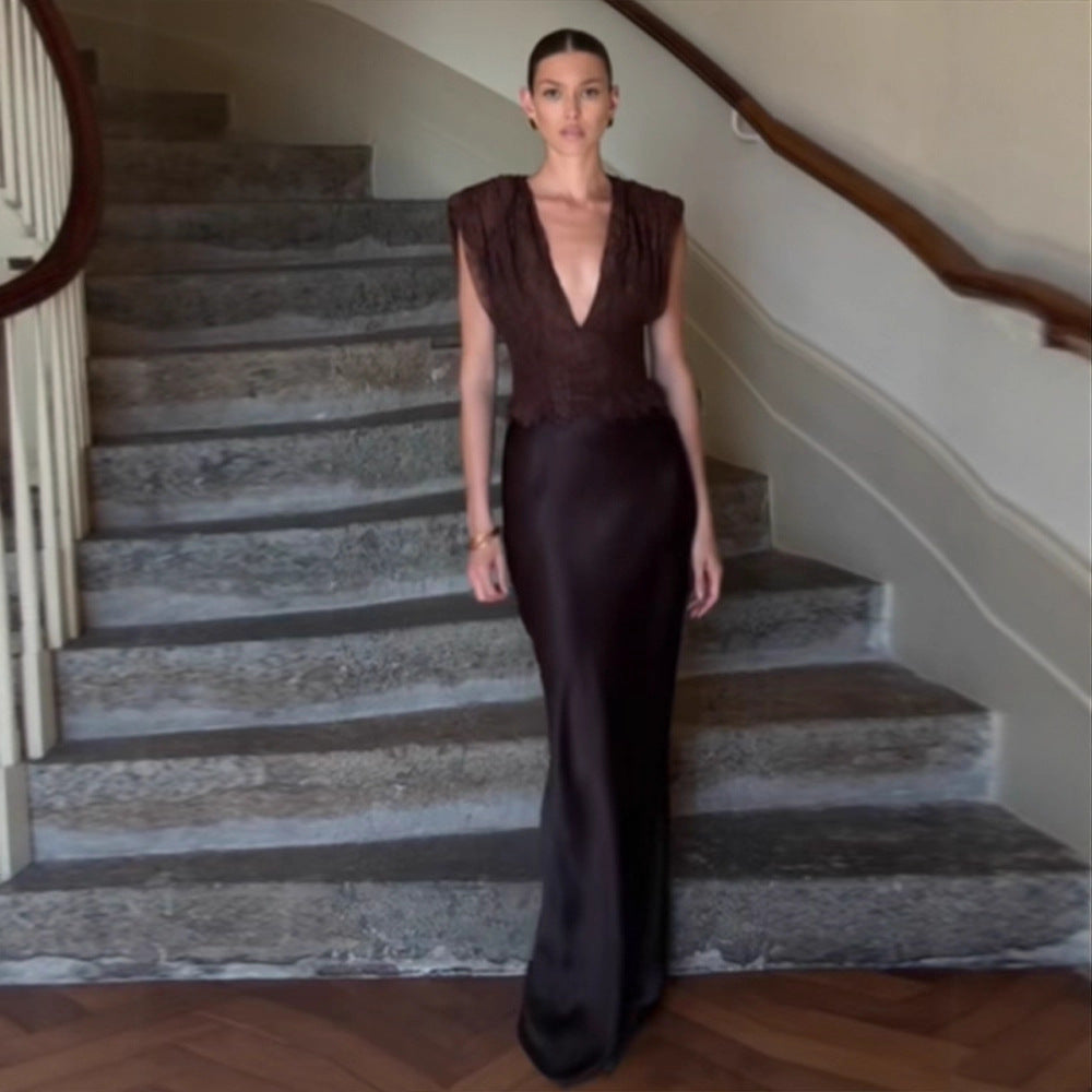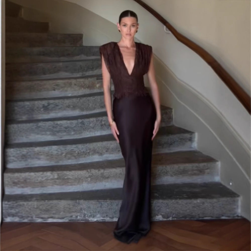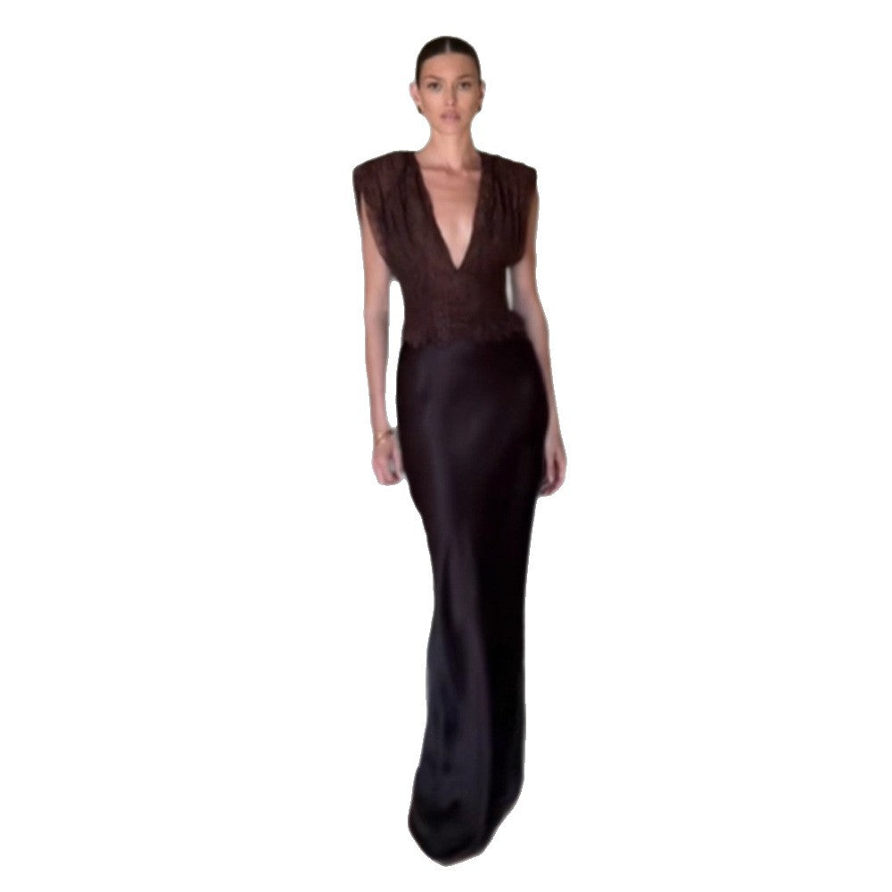 Opdag den udsøgte, gulvlange aftenbuket fra Stilla, der forener elegance og stil i perfekt harmoni. Denne betagende kjole har en dyb V-udskæring, der virker diskret forførende og smigrer bærerens silhuet.