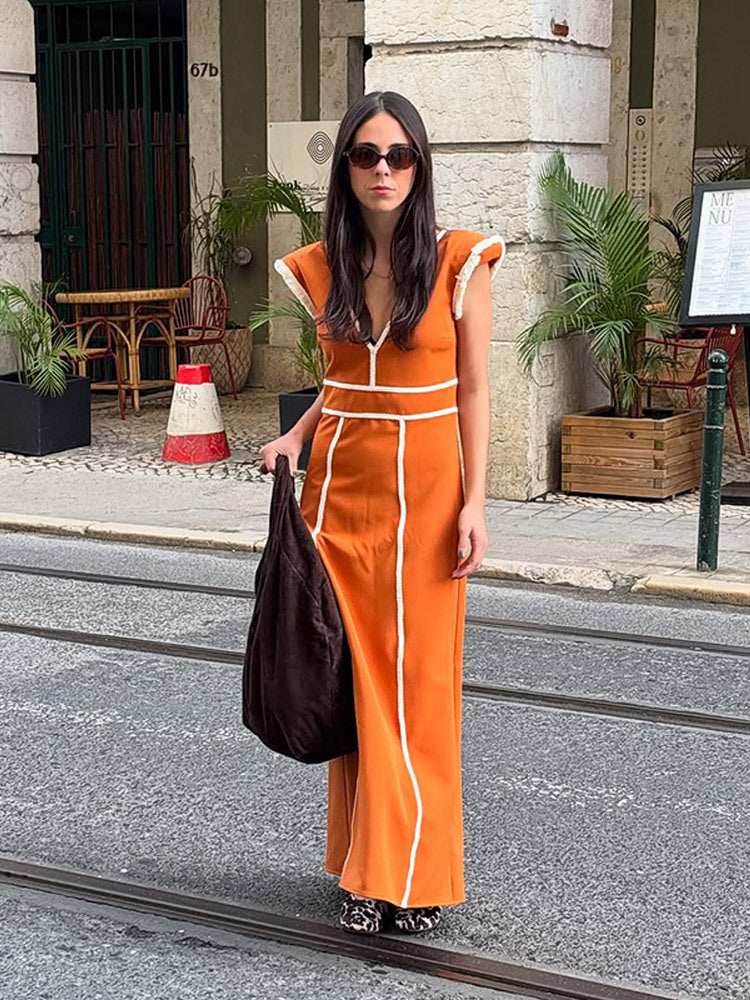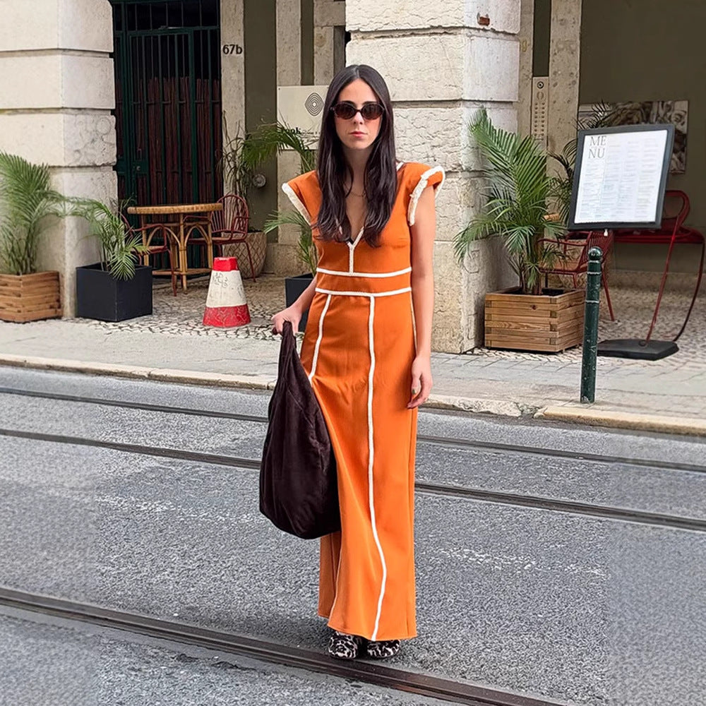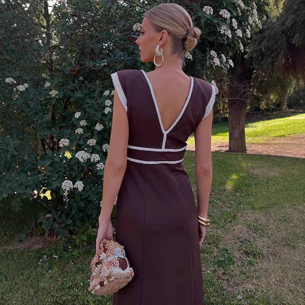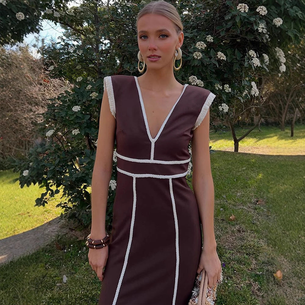Oplev den fortryllende charme ved vores elegante cocktailkjole, der tilbyder en harmonisk kombination af stil og komfort. Denne kjole imponerer med sin dybe V-udskæring og de raffinerede flæsedetaljer, der perfekt fremhæver din feminine silhuet.
