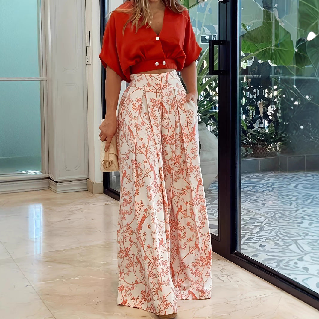 Opdag vores fremragende sæt, der perfekt kombinerer elegance og afslappethed. Det Crop-Top imponerer med sin stilfulde knaplukning og den løse pasform, der sikrer maksimal komfort. De korte, overskårne ærmer giver en moderne silhuet, mens det elegante udseende er ideelt til sommerlige anledninger.