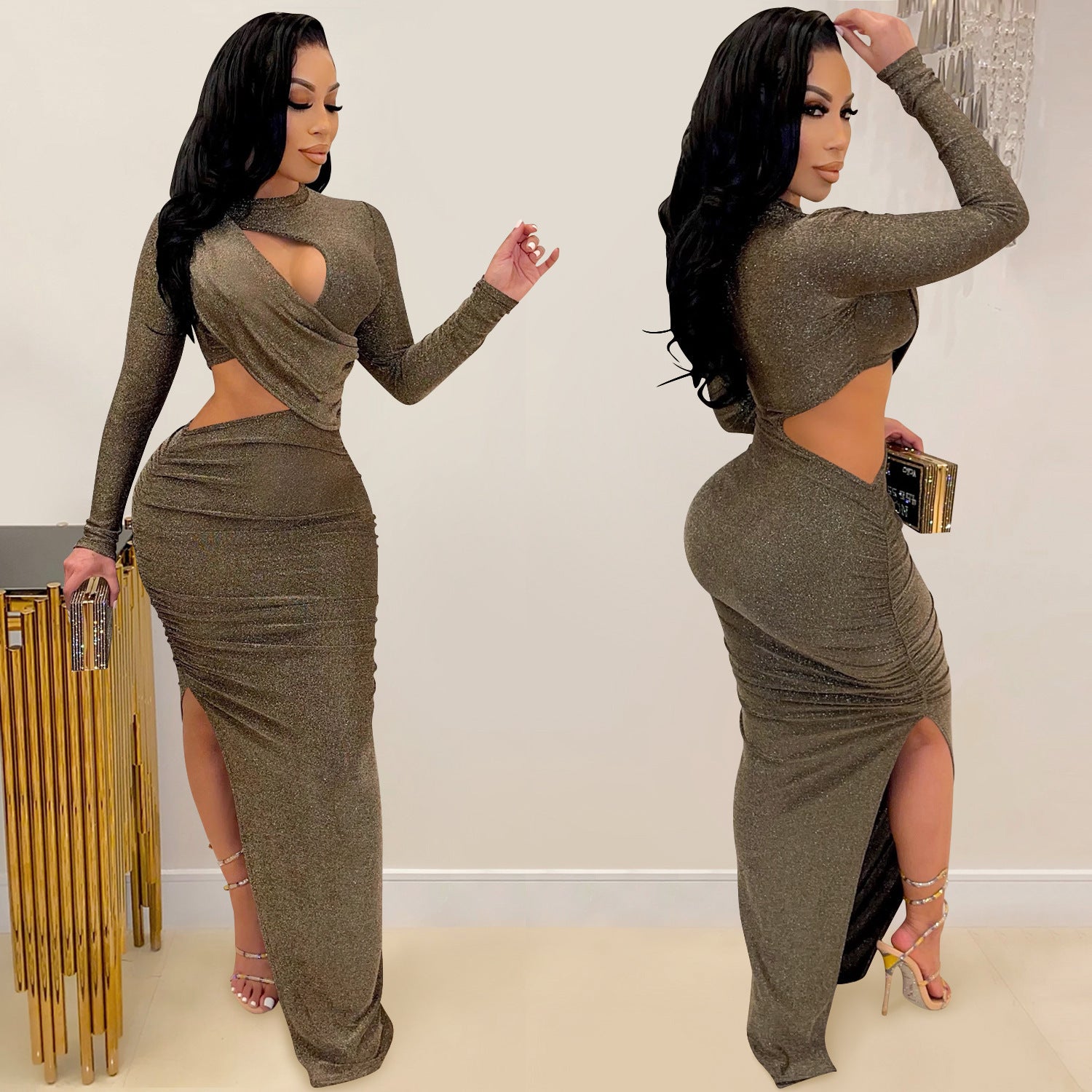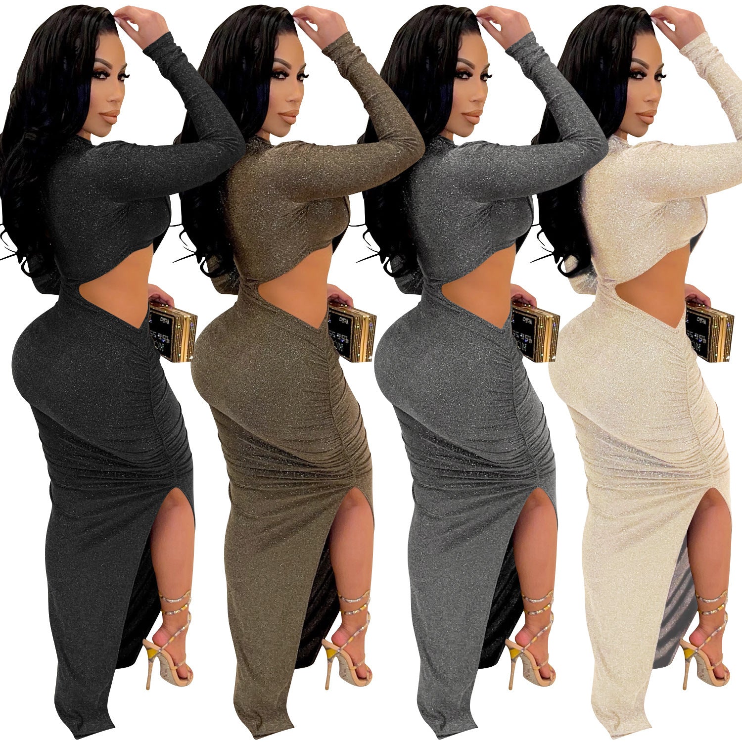 Oplev den ultimative glamour med vores damers elegante cut-out maxikjole. Denne fantastiske kjole er perfekt til særlige begivenheder og aftensarrangementer. Fremstillet af højkvalitets, skinnende materiale, der elegant tilpasser sig dine kurver.