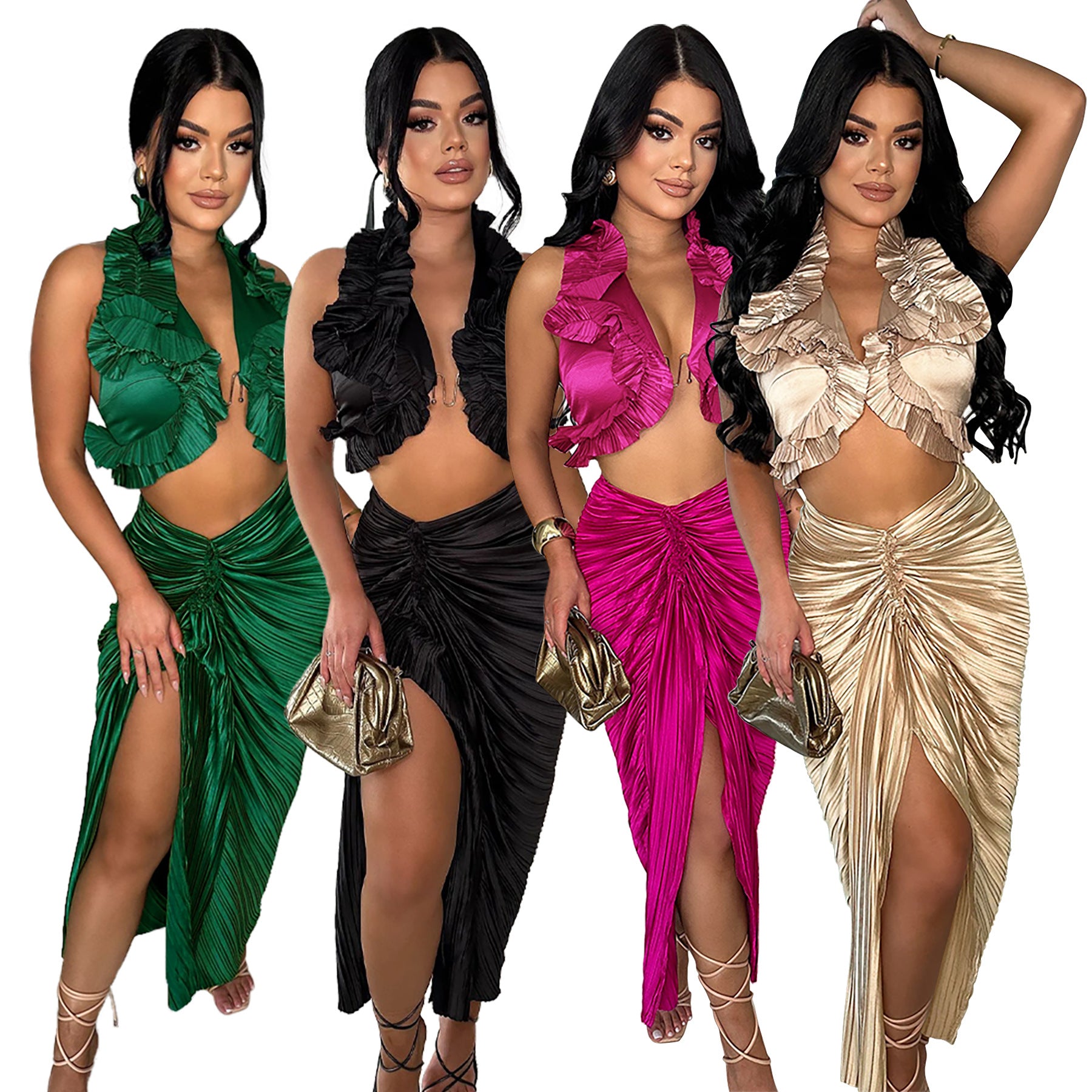 Opdag vores Dame Elegant Draperet Sæt med Ruffles-Top og Maxi-Nederdel fra Stilla – det perfekte valg til særlige lejligheder og glamourøse aftenarrangementer. Dette udsøgte ensemble består af en figur tilpasset top med raffinerede rynker, der smigrer din silhuet, og en lang, draperet nederdel, der har en høj slids for et fortryllende look.