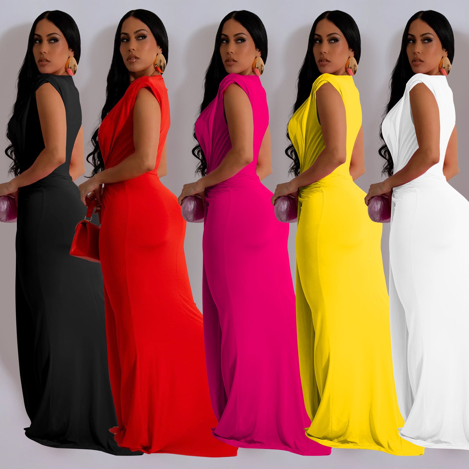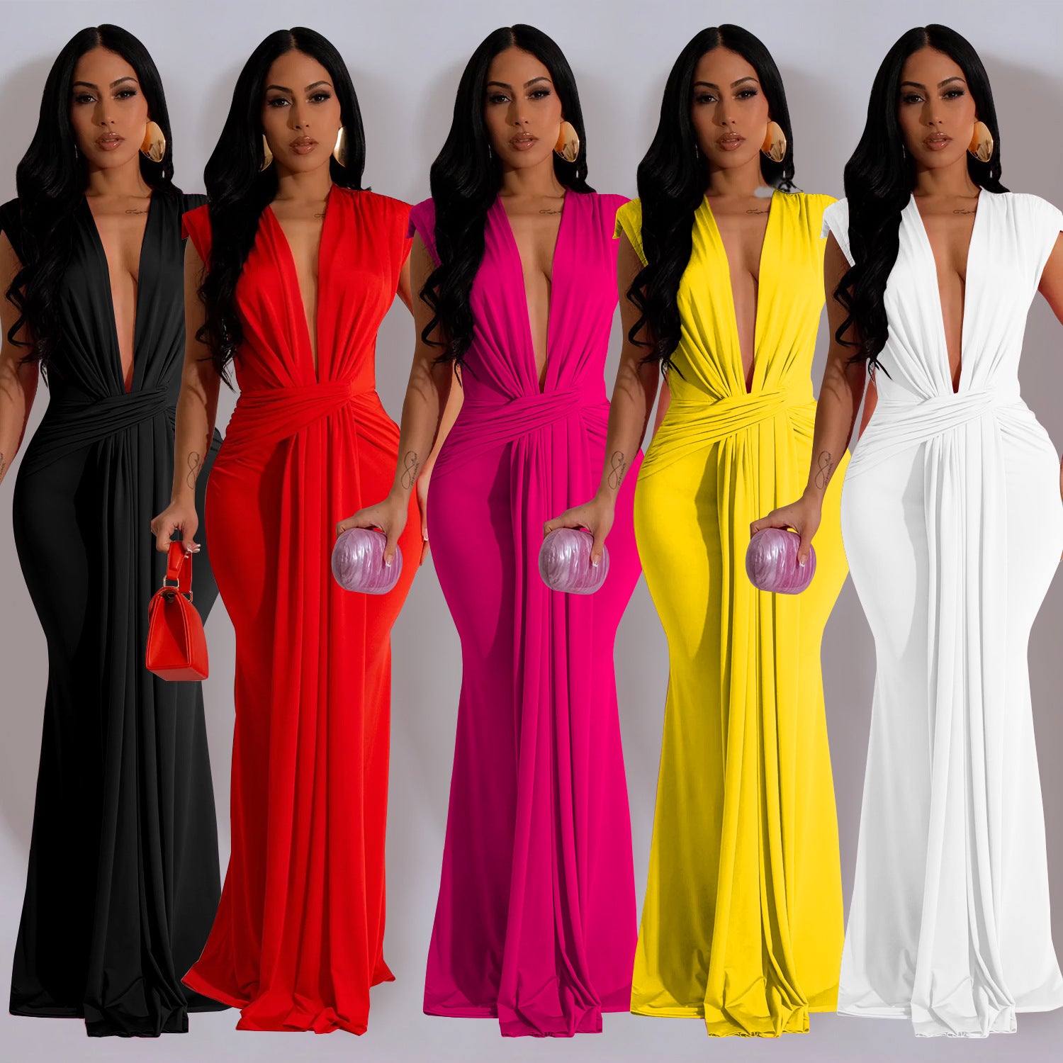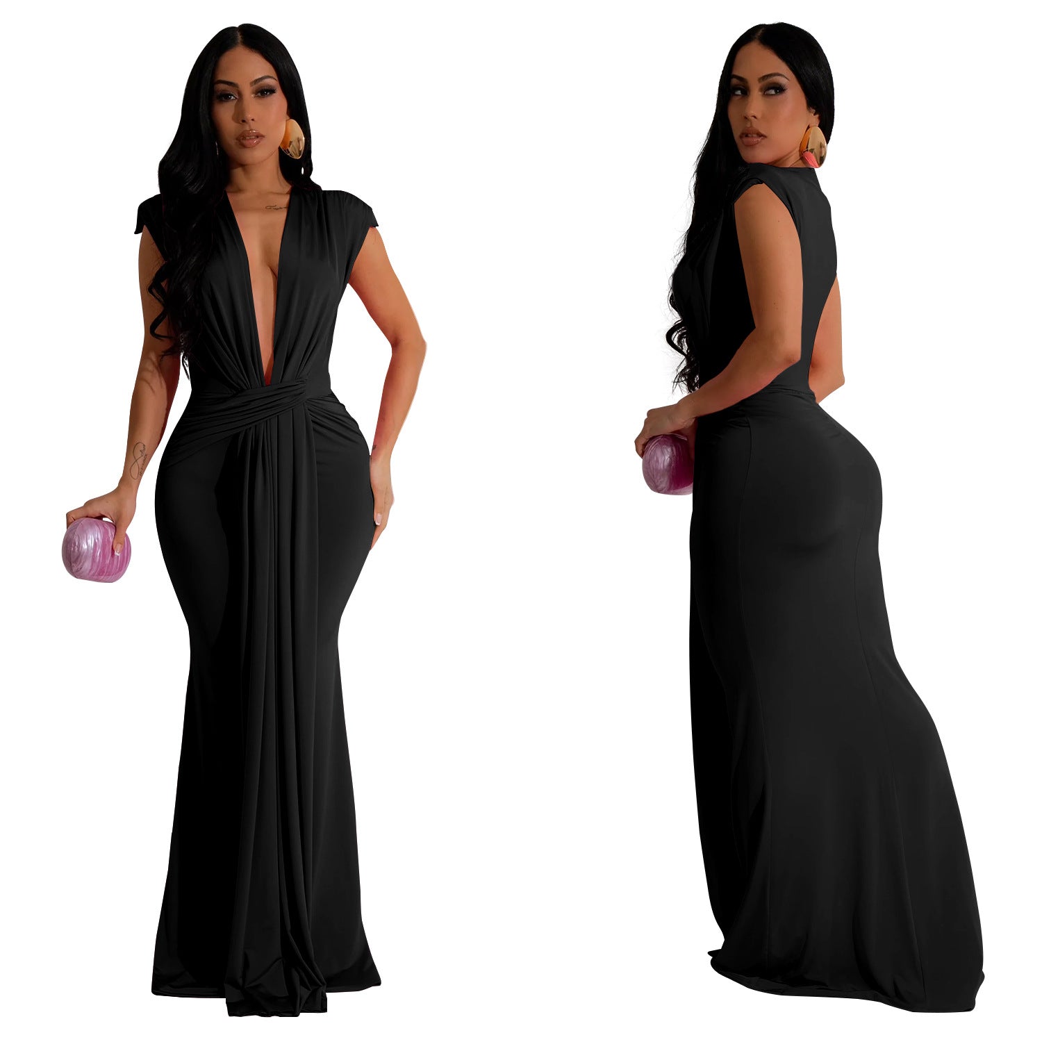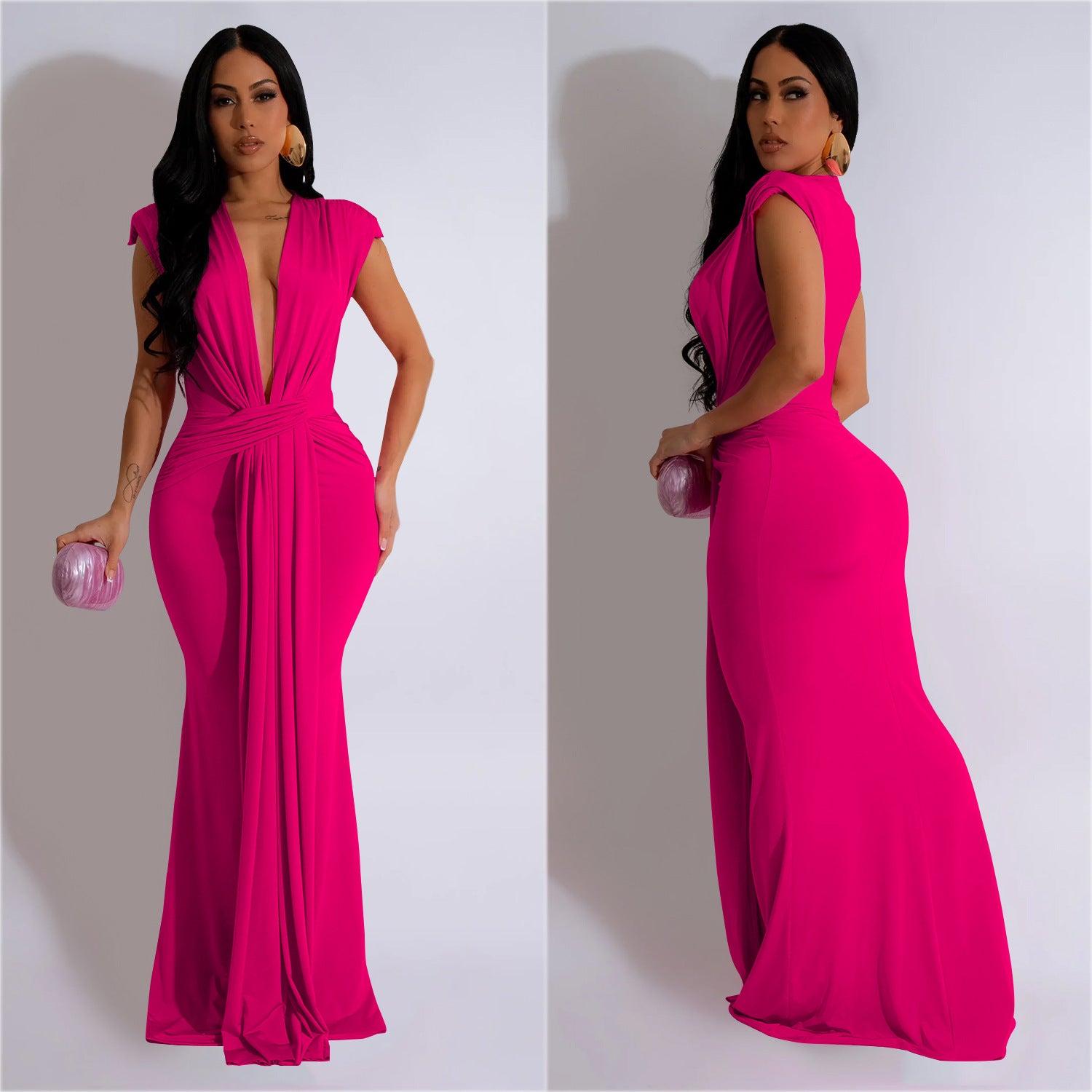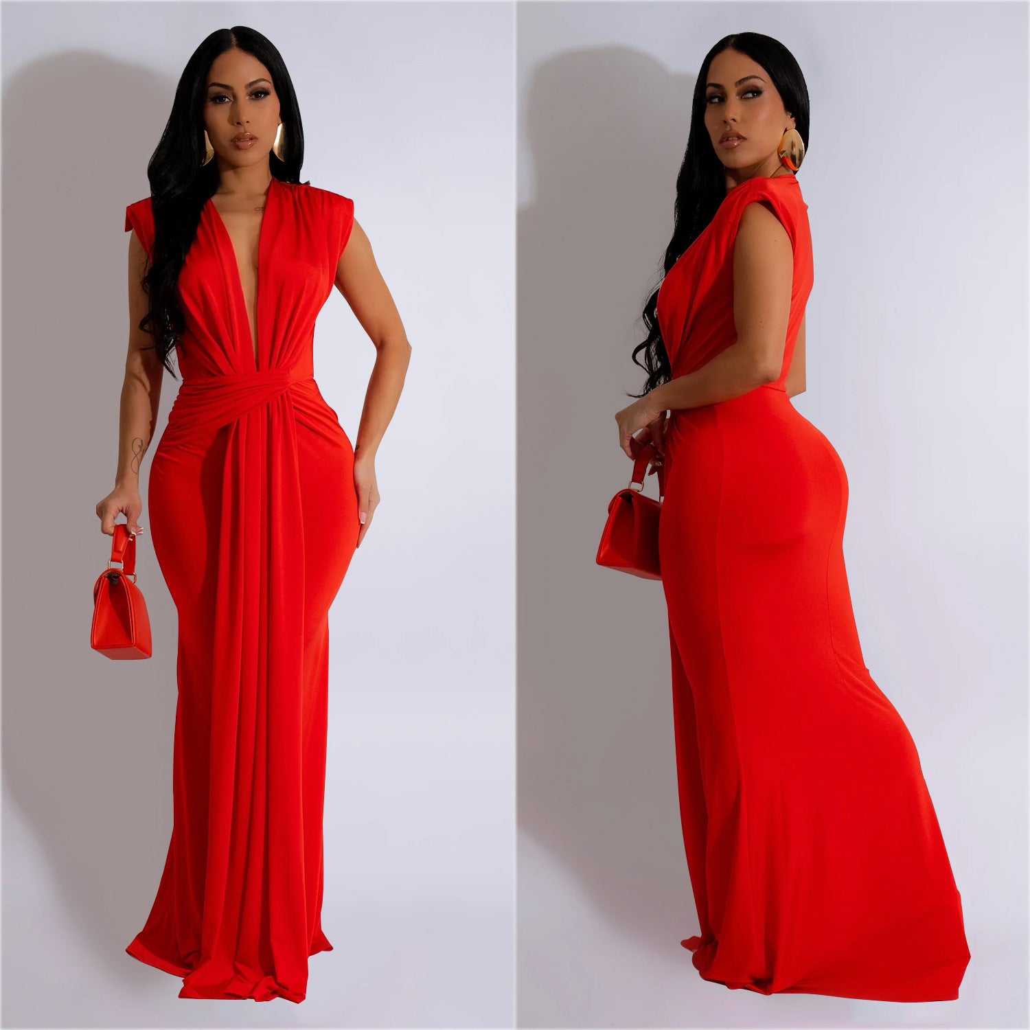 Opdag den eksklusive, elegante maxikjole, der er perfekt til både særlige anledninger og glamourøse aftener. Denne kjole har en spændende dyb udskæring, der fremhæver en forførende silhuet, mens den raffinerede knudedetaljering i taljen giver en flatterende pasform.