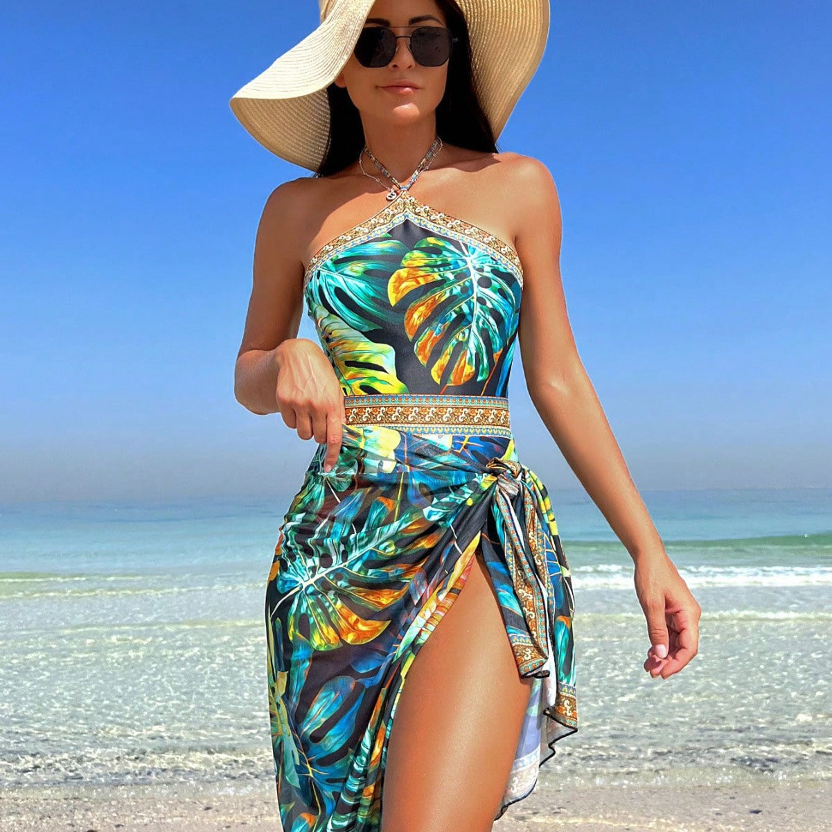 Vores elegante heldragt med blomster kimono overtræk er det ideelle valg for modebevidste kvinder, der værdsætter både elegance og komfort. Med et fortryllende blomsterdesign, der straks spreder godt humør, og en fantastisk kimono, der perfekt fremhæver din silhuet, er dette outfit et must-have til enhver strandtur.