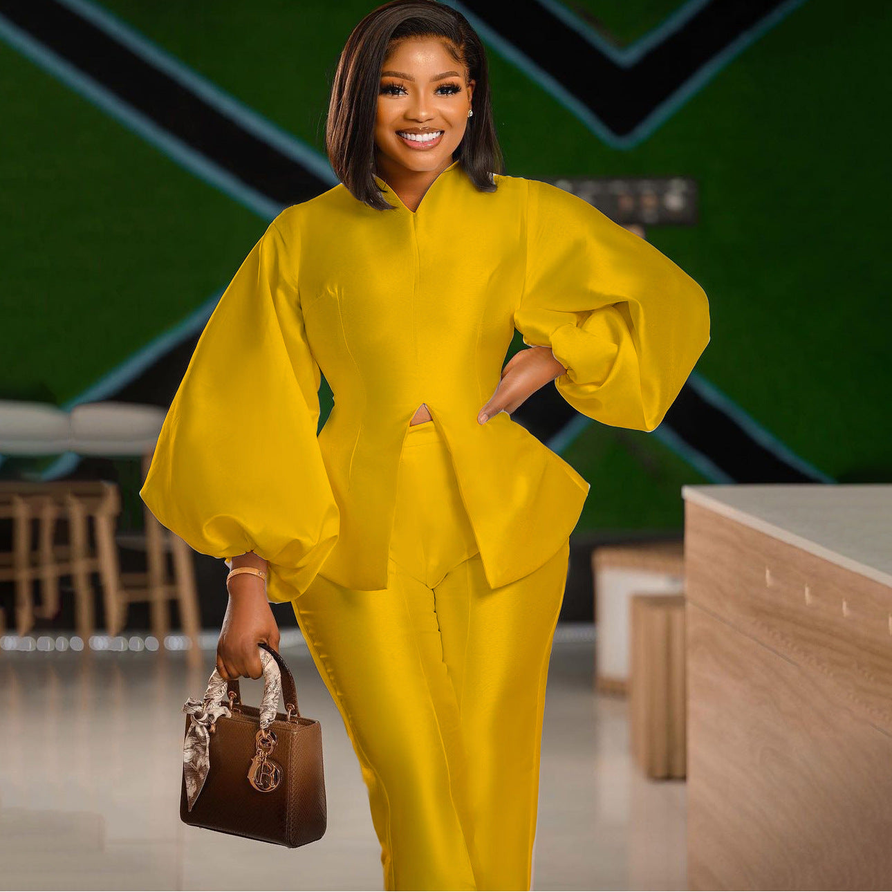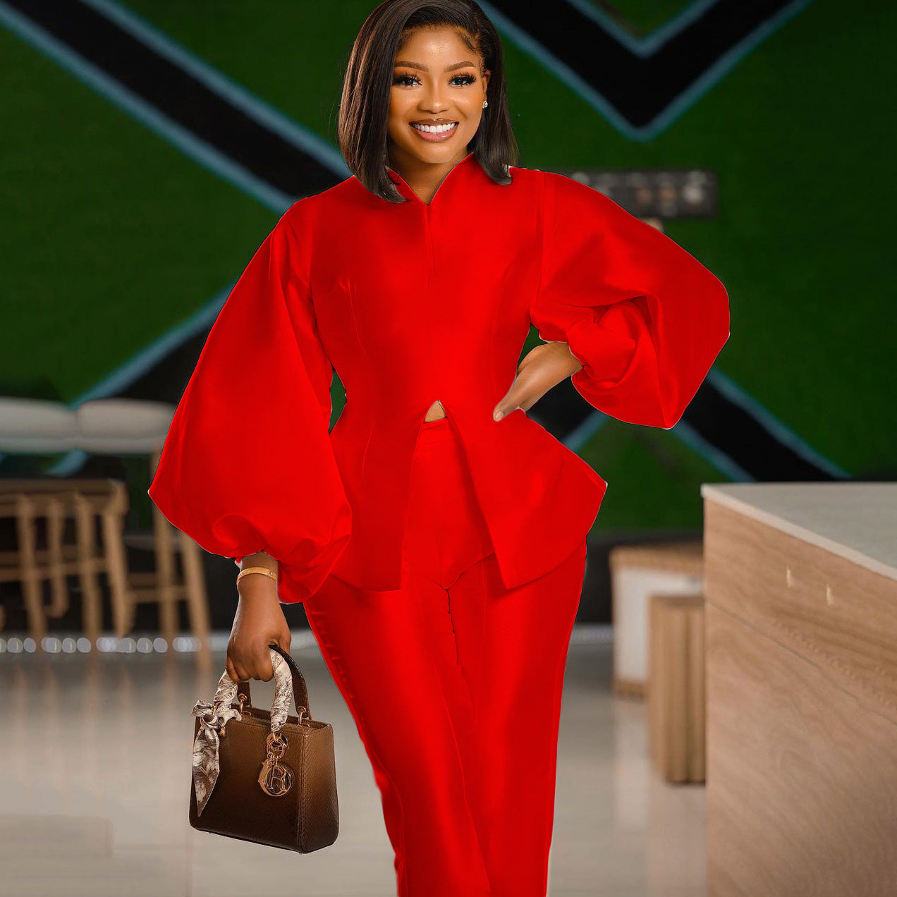Dette stilfulde damesæt kombinerer elegance og komfort på perfekt vis. Den elegante top har voluminøse ærmer og en moderigtig cut-out detalje, der fremhæver figuren fordelagtigt. Den slanke silhuet af jakkesættet understreger de feminine kurver og giver samtidig et moderne udseende.