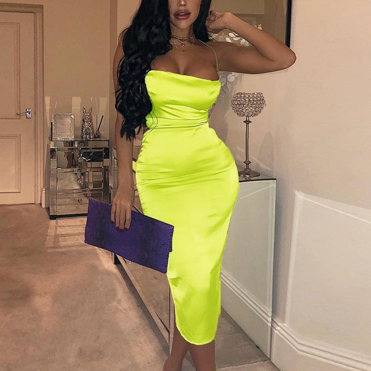 Opdag det perfekte aftenoutfit med denne elegante tætsiddende satin-kjole fra Stilla. Kjolen har en skulderfri stil, der fremhæver skuldrene og præsenterer en fantastisk udringning.