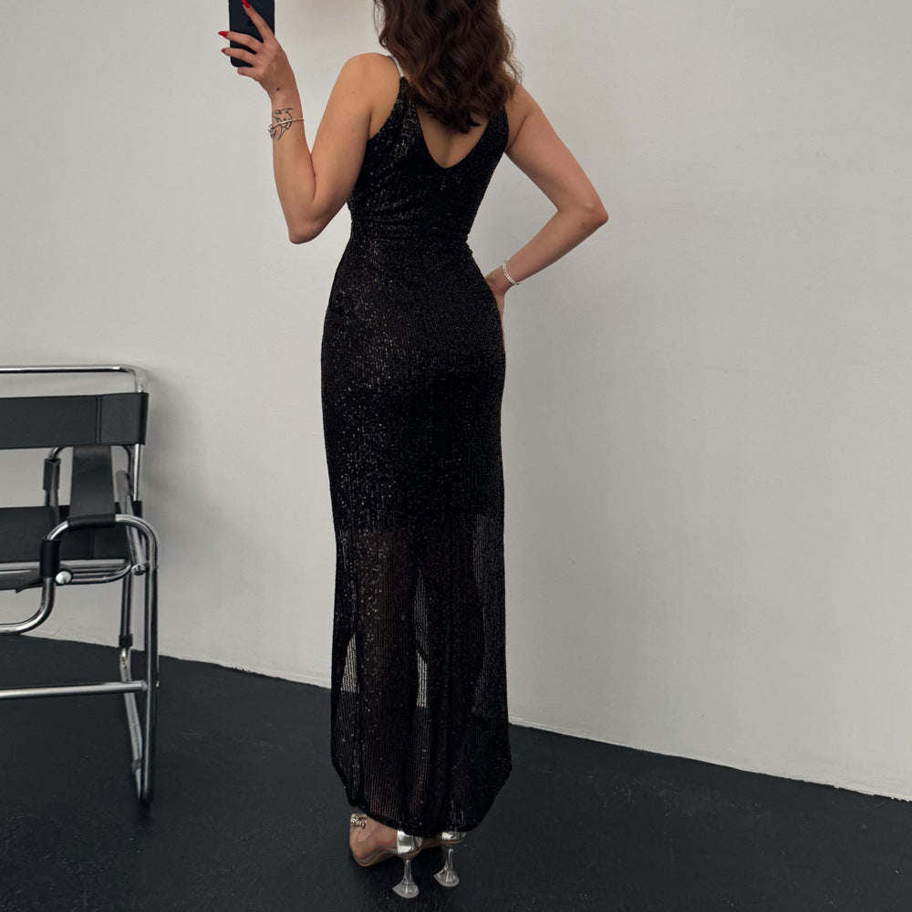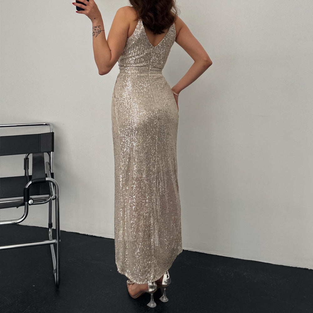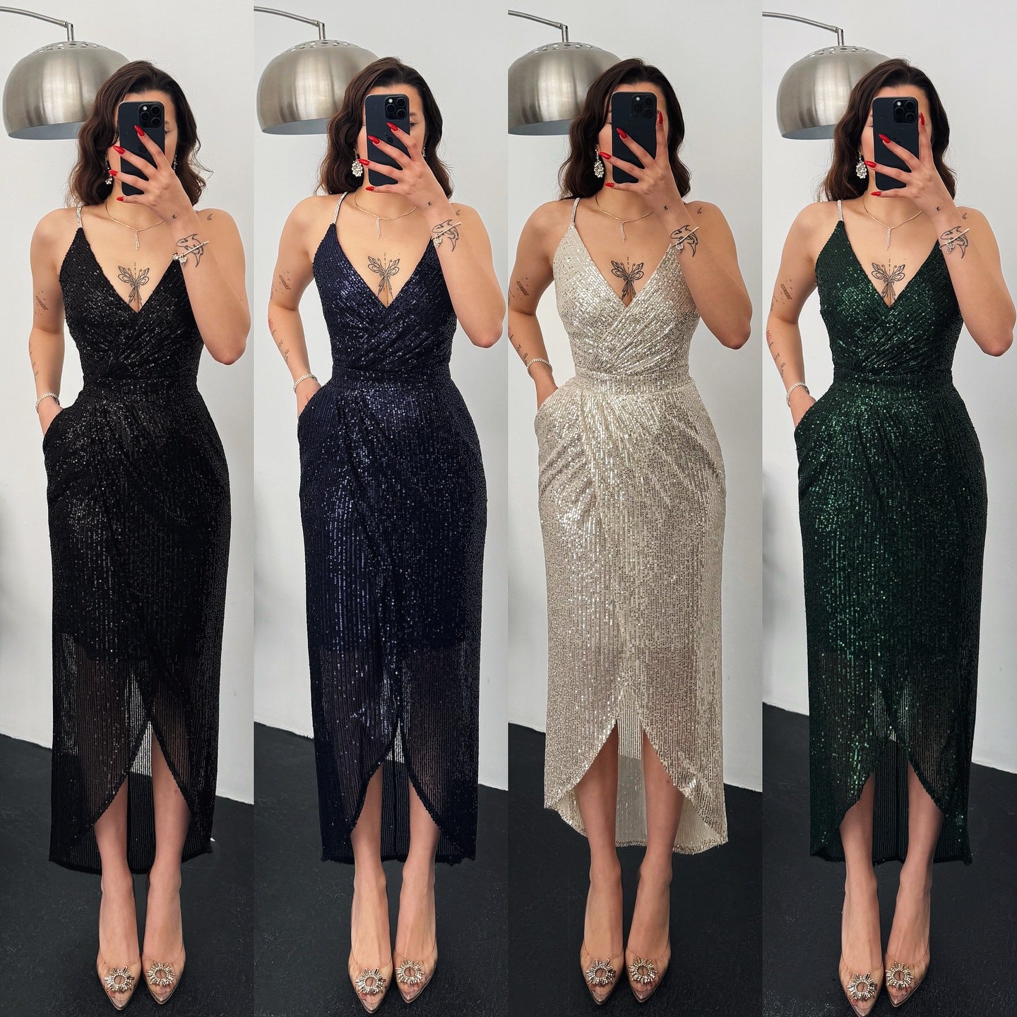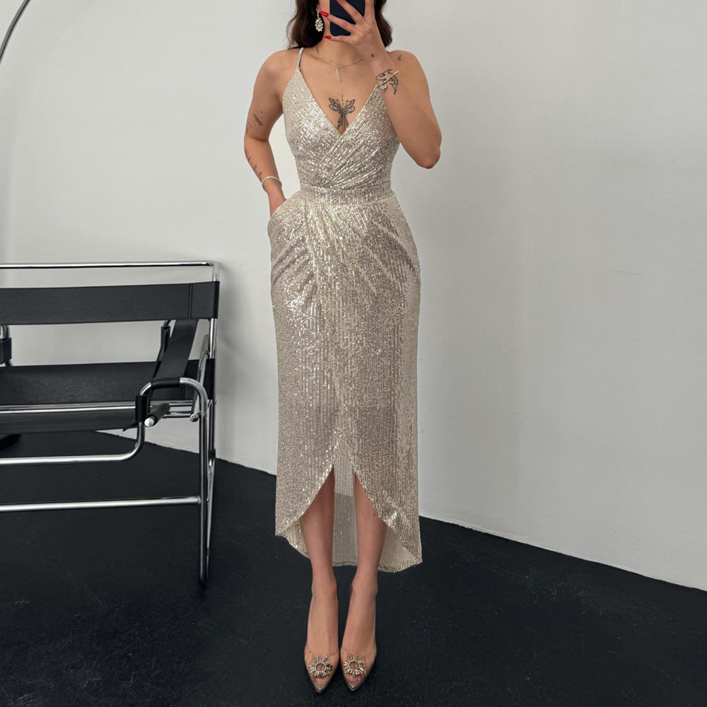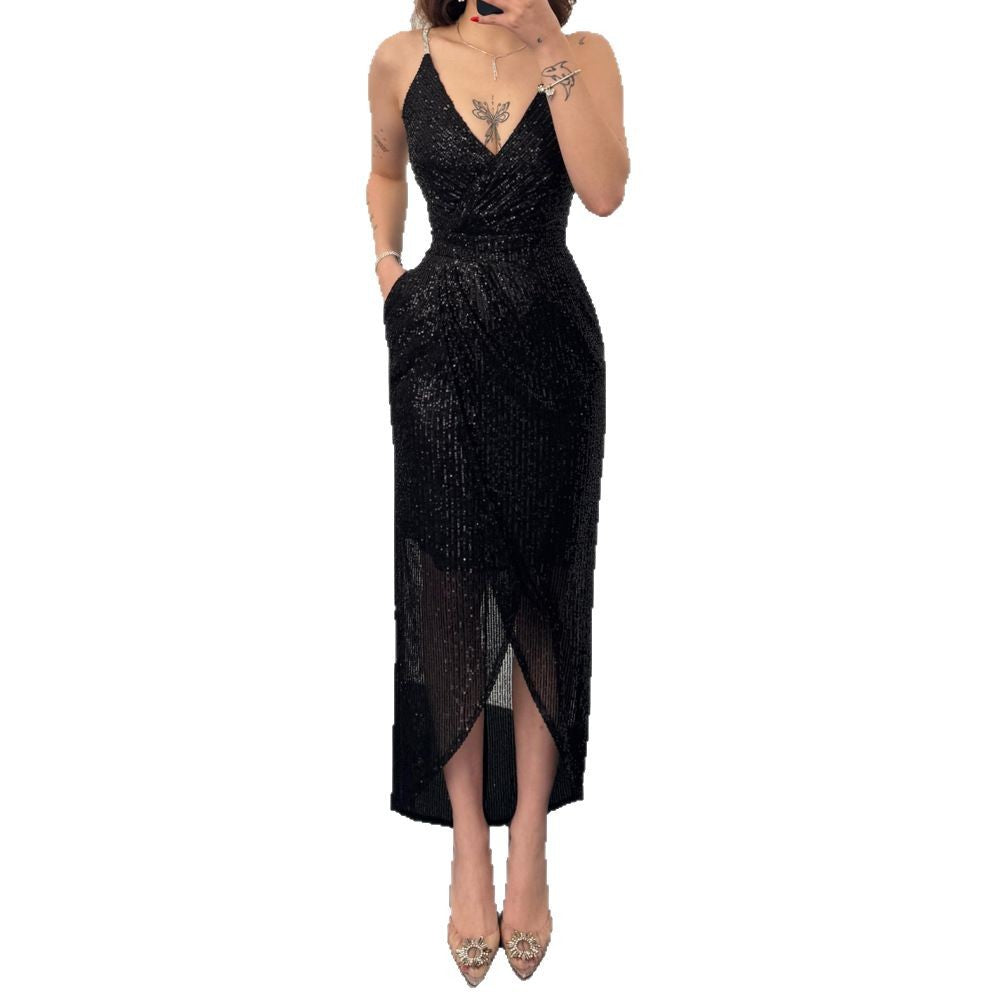 Oplev vores imponerende dames elegante funktionskjole, der giver den perfekte blanding af stil og komfort. Denne kjole udmærker sig ved sit glitrende pailletstof, der giver ethvert udseende et strejf af glamour. Den dybe V-udskæring fremhæver diskret décolletéen og skaber en elegant silhuet.