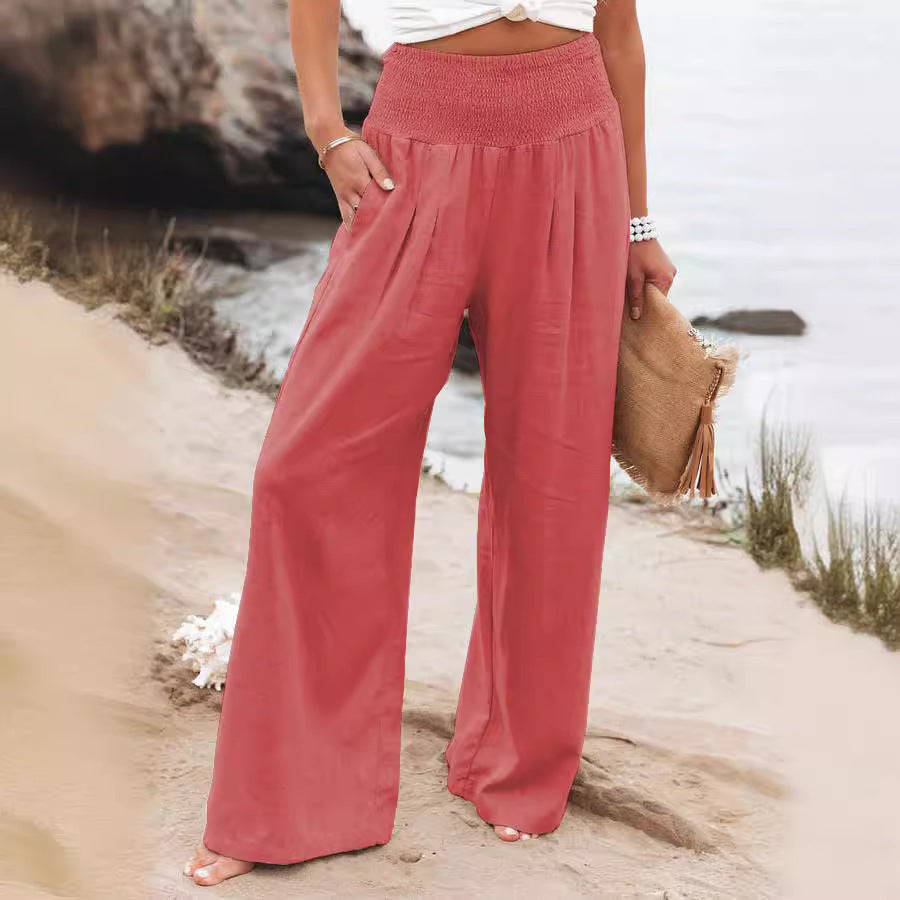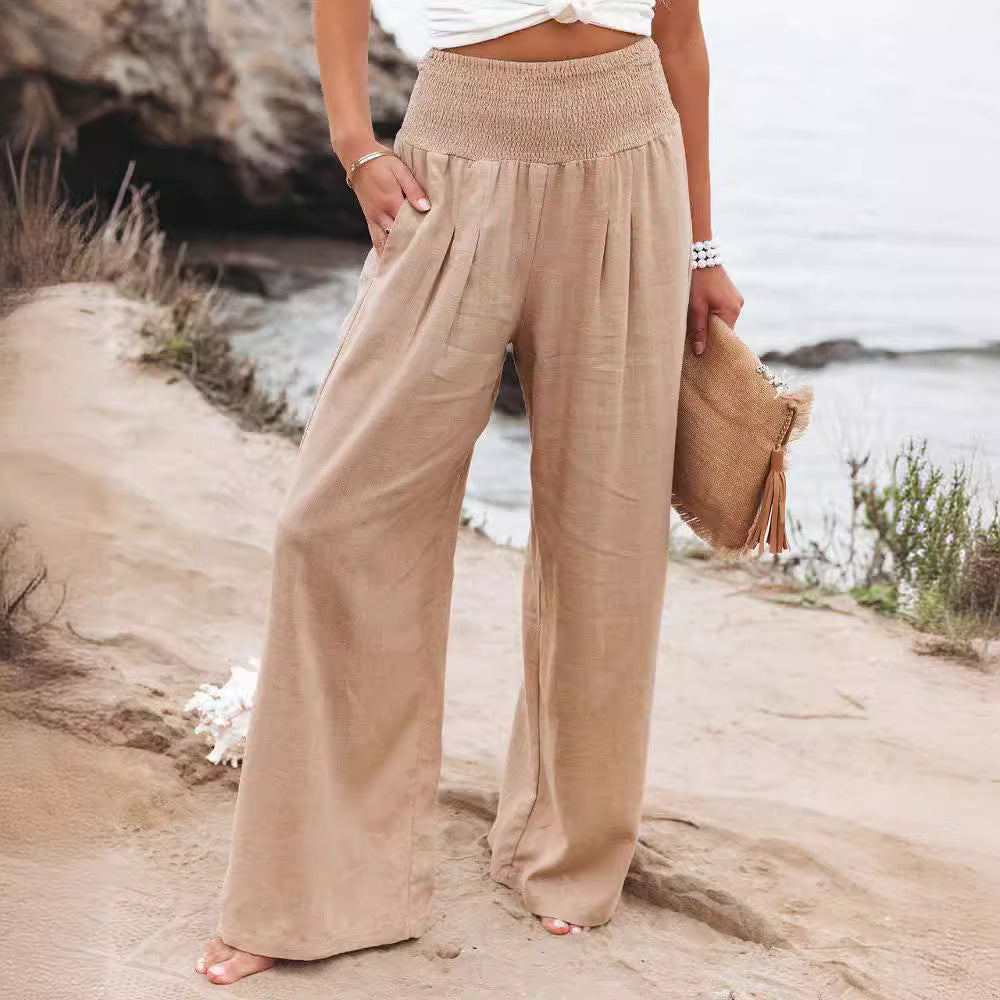 Opdag kombinationen af stil og komfort med vores elegante højtaljede bukser lavet af let, åndbart stof. Disse bukser tilbyder ikke kun et moderigtigt design, men er også perfekte til varme dage og særlige anledninger.