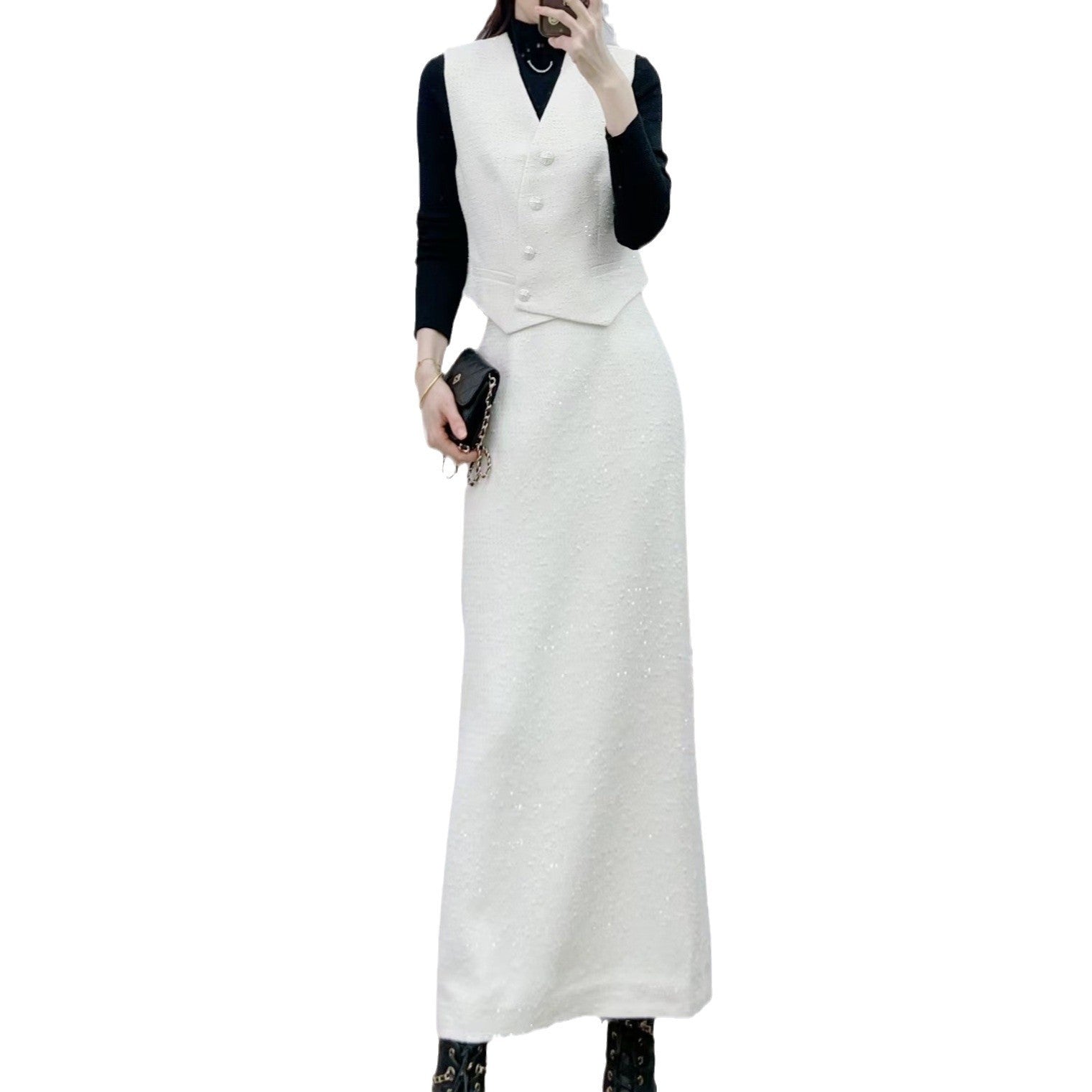 Opdag det perfekte look til særlige lejligheder med vores elegante dames jakkesæt. Dette stilfulde sæt består af en tætsiddende vest og en lang nederdel, der er lavet af højkvalitets, blødt stof. Den fint strukturerede overflade giver outfittet et luksuriøst præg.