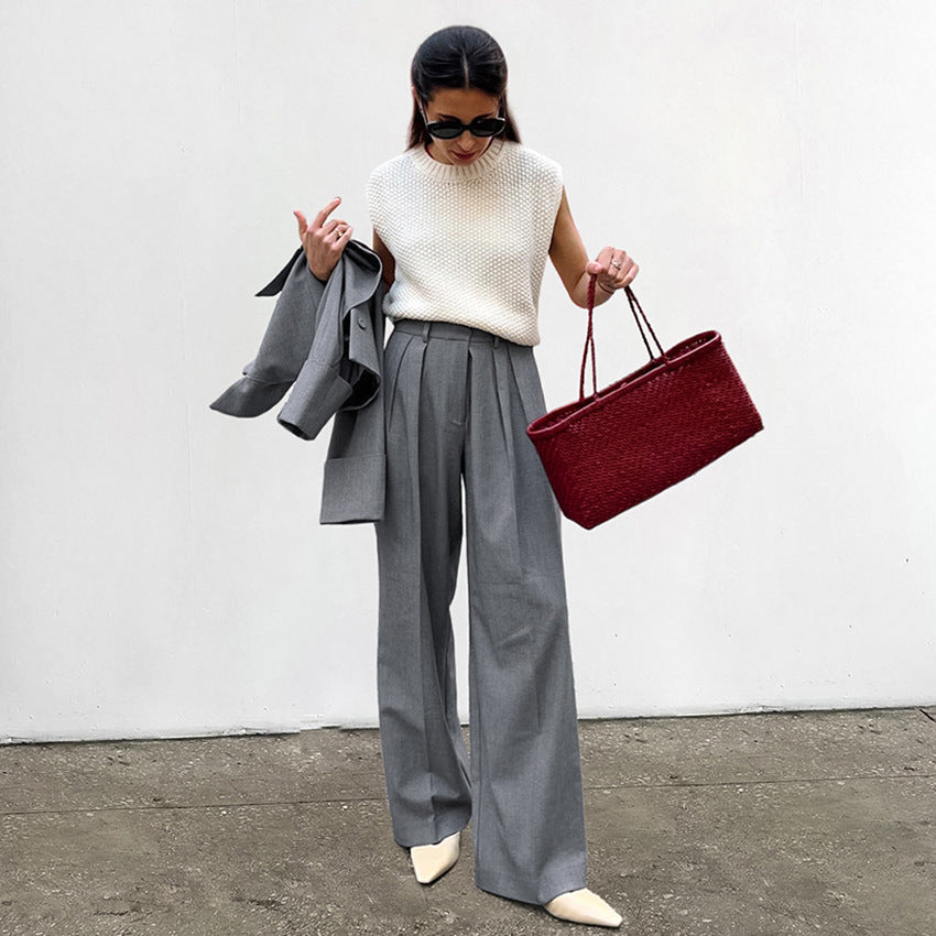 Opdag det Elegante Sæt fra Stilla, der forener stilfuldt design med behagelige materialer. Dette sæt består af et højtaljeret bukser og en moderigtig ærmeløs top, der er perfekt til formelle anledninger eller forretningsmøder.