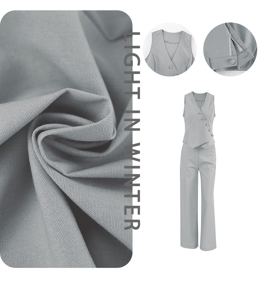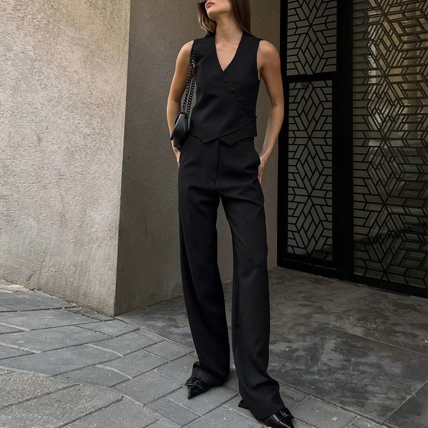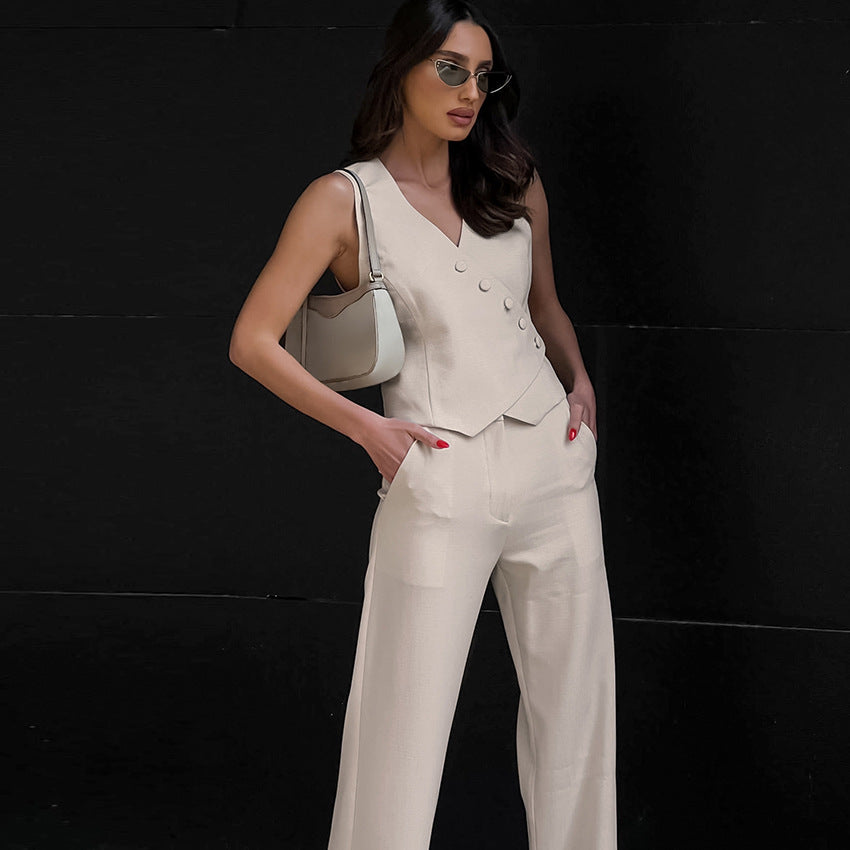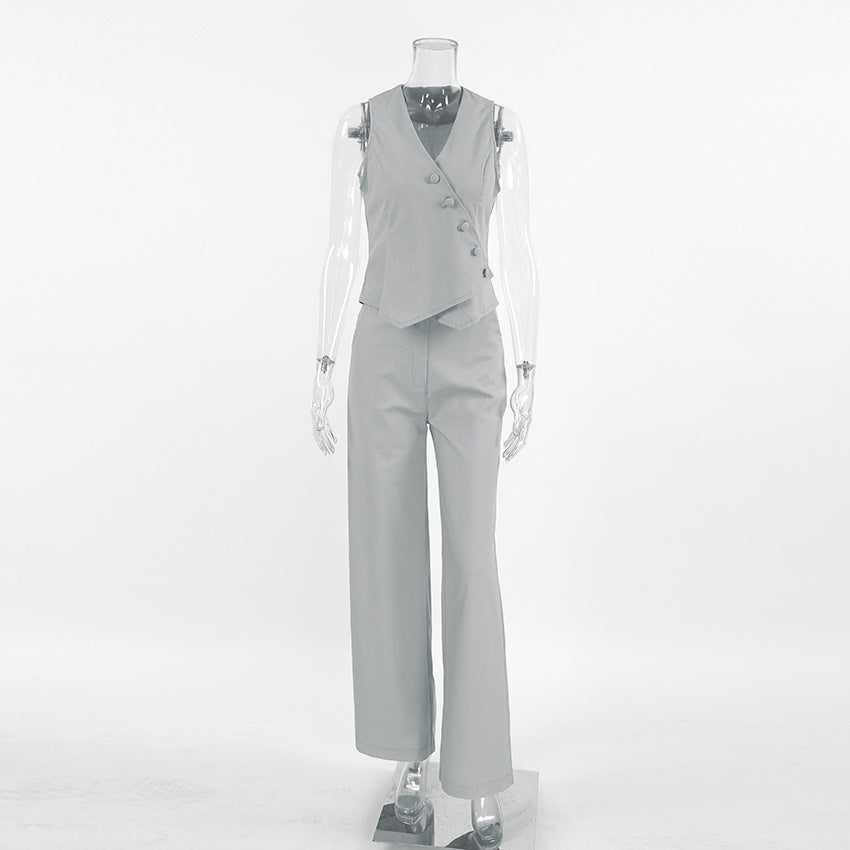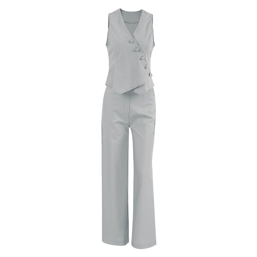 Oplev vores elegante jakkesæt, der både forener stil og komfort. Dette sæt består af en skræddersyet blazer med fashionable knapdetaljer og et løstsiddende par bukser, der tilbyder en flatterende silhuet. Ideelt til forskellige anledninger, fra forretningsmøder til elegante aftenarrangementer.