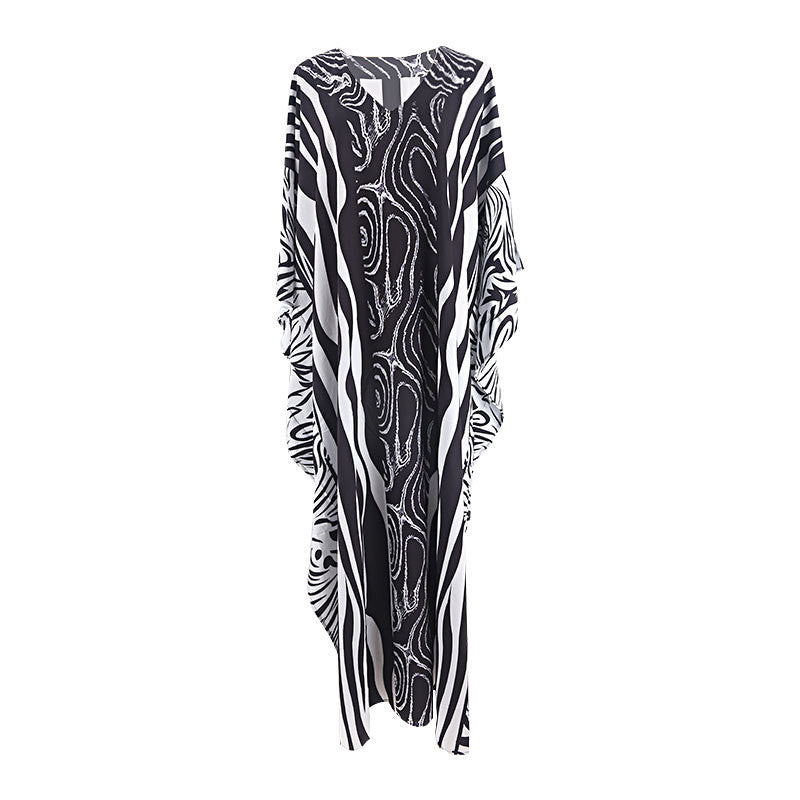 Opdag vores dames elegante kaftan, der imponerer med sit betagende zebramønster design og de luksuriøse glitrende accenter. Denne kaftan er ideel til enhver begivenhed, uanset om det er en sommerfest, en strandfest eller en elegant aften.