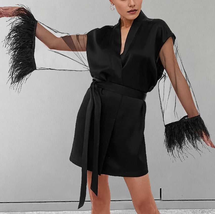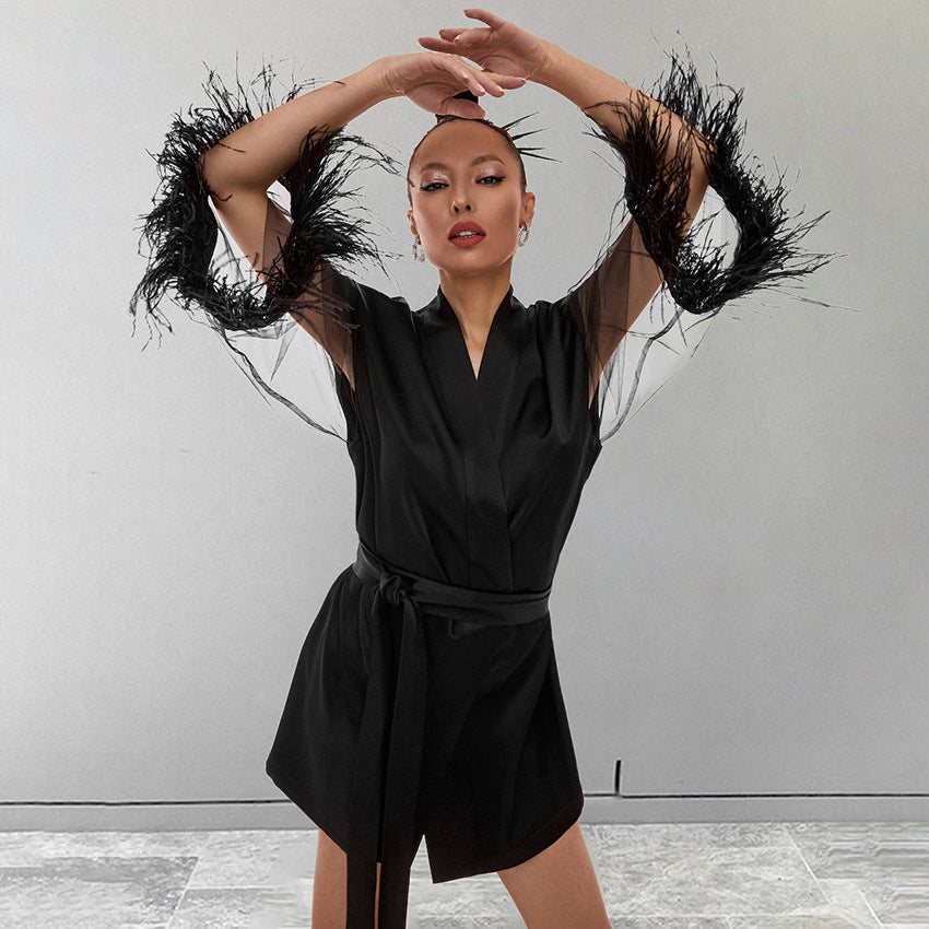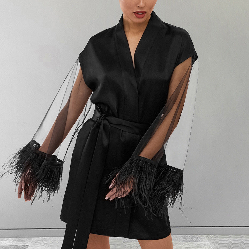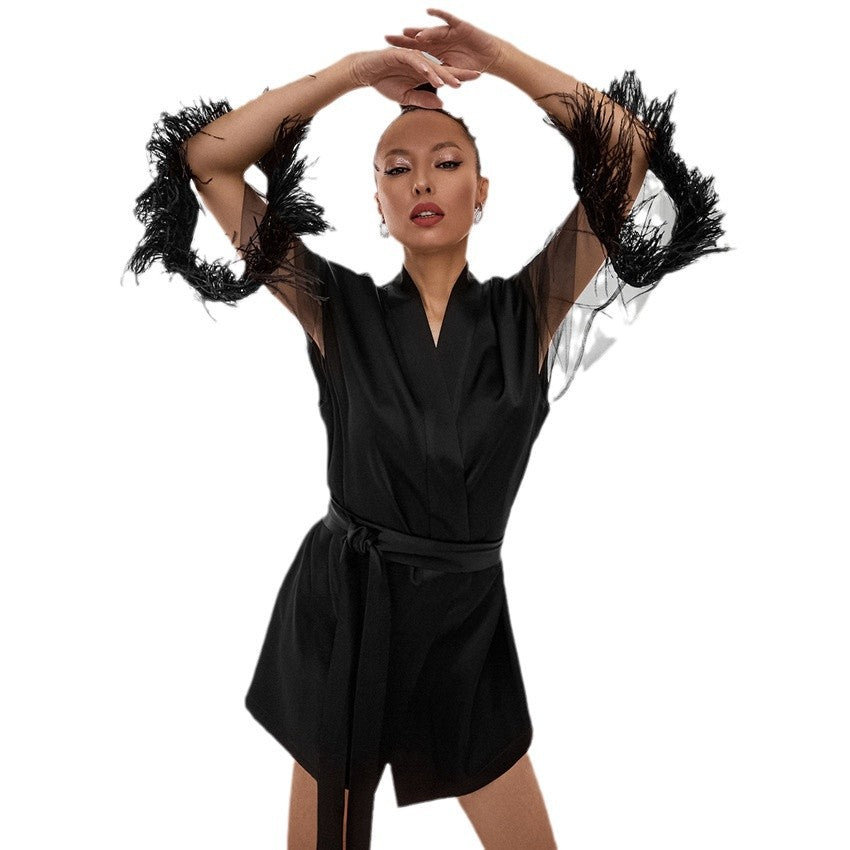 Denne stilfulde kimono-style kortkjole er det perfekte valg til særlige arrangementer og festlige lejligheder. Med sine voluminøse ærmer, der er prydet med fine fjerdekorationer, sikrer den et imponerende udseende og et strejf af luksus.