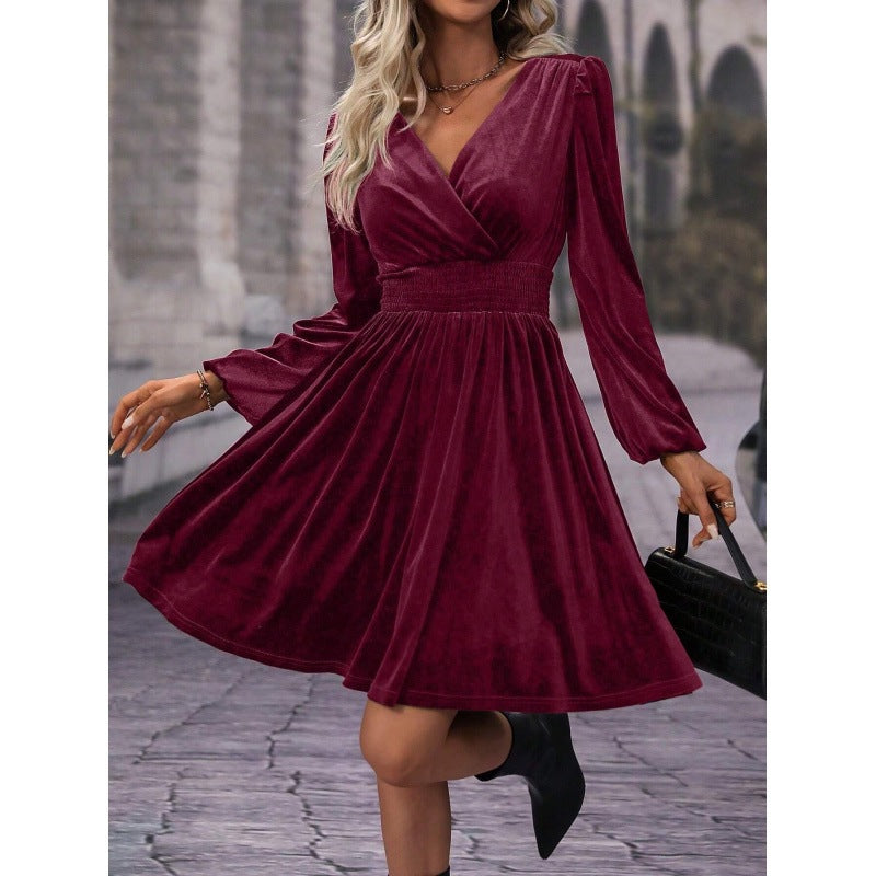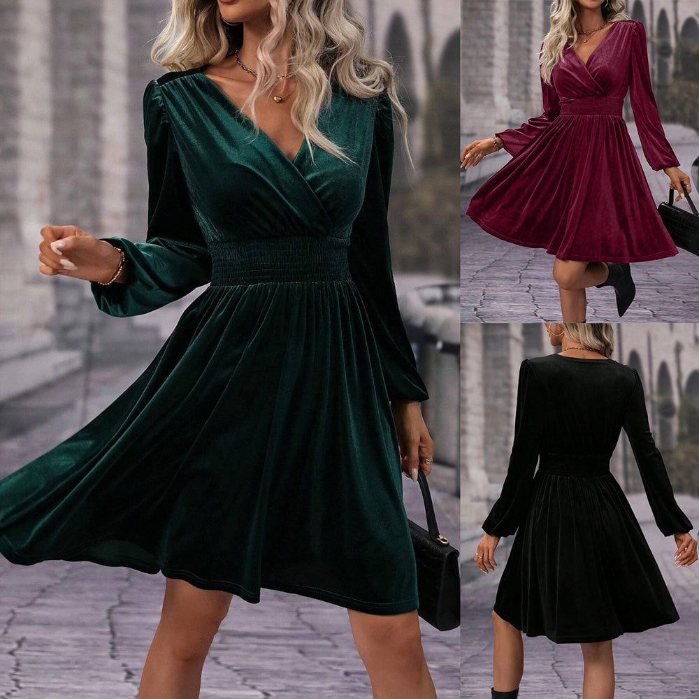 Oplev vores dames elegante samtkjole, der er ideel til festlige anledninger som bryllupper, fester eller elegante middage. Fremstillet af høj kvalitet, blødt fløjl, tilbyder denne kjole både komfort og stil.