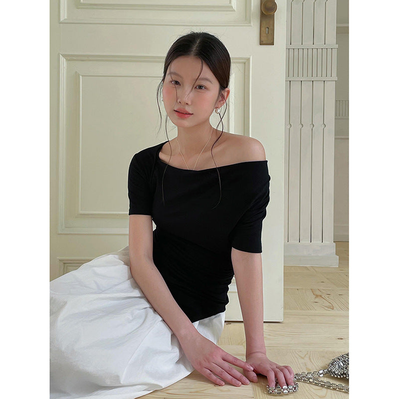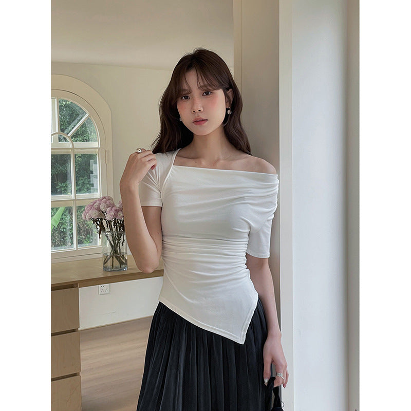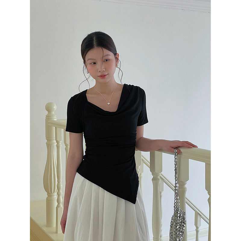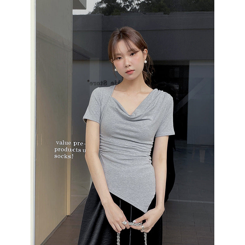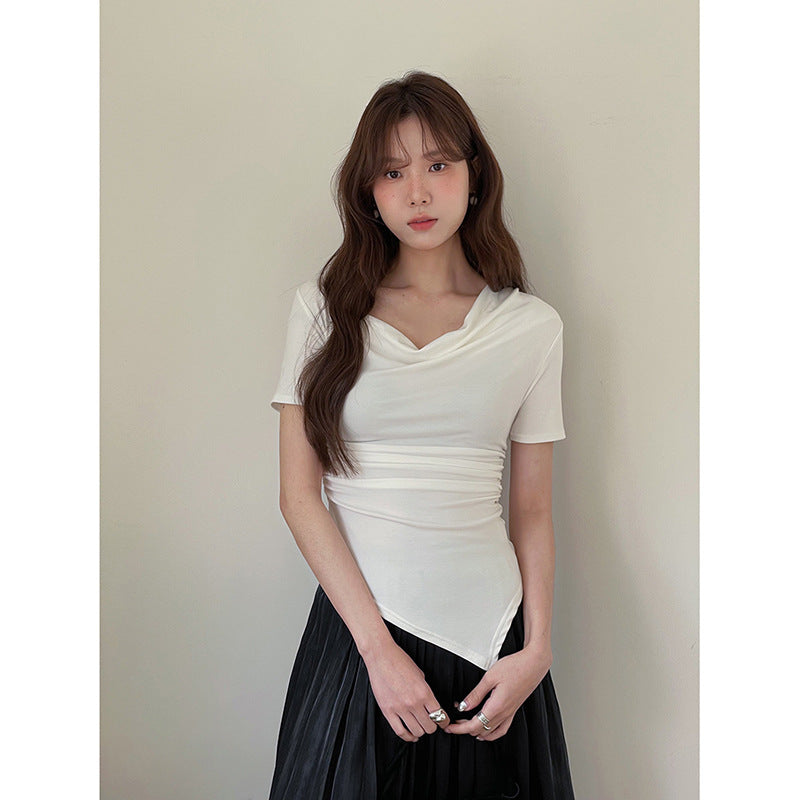 Dette stilfulde omslagstop imponerer med sit unikke design og sine højtkvalitets materialer. Med en raffineret asymmetrisk nederkant og elegante folder tilbyder det både komfort og et strejf af femininitet.
