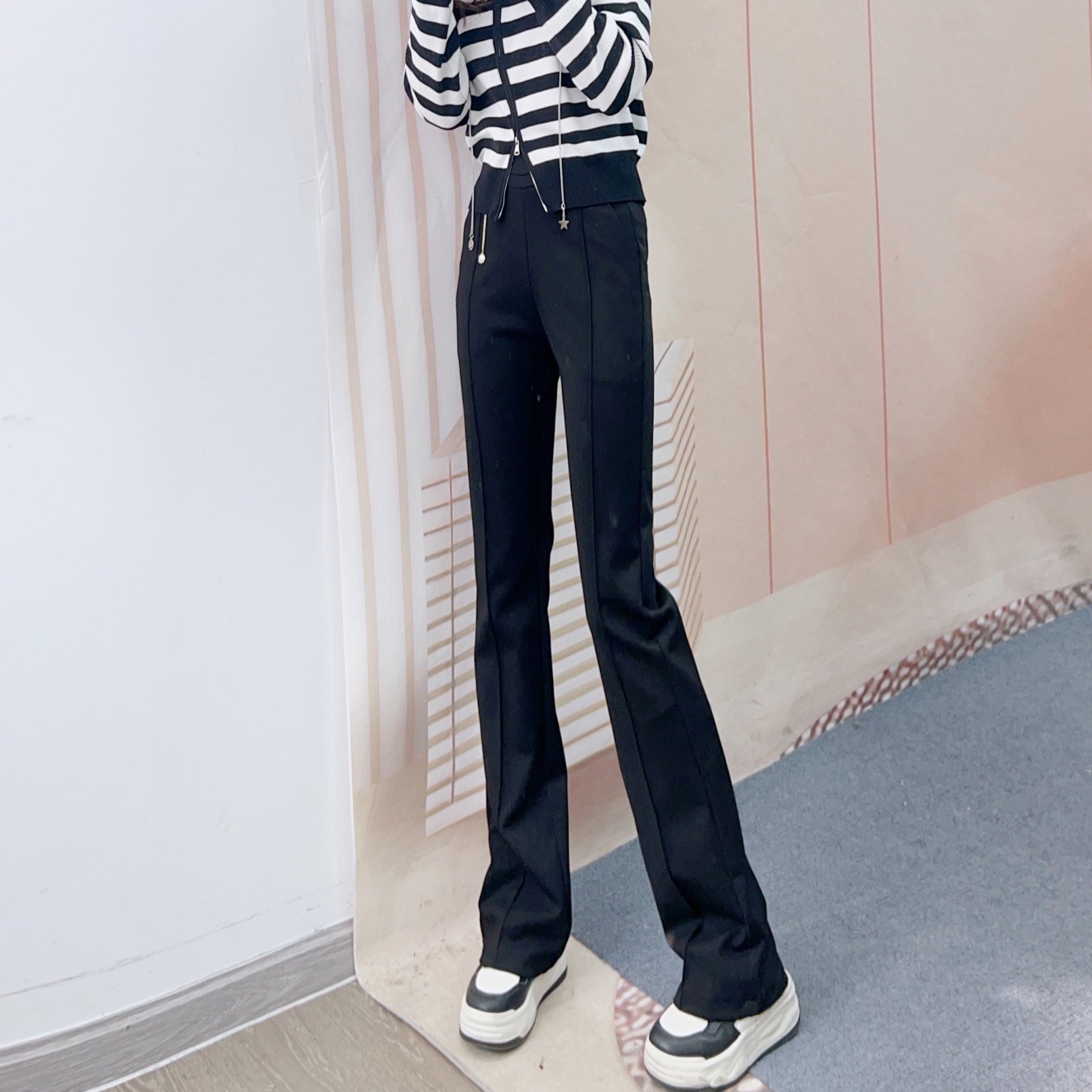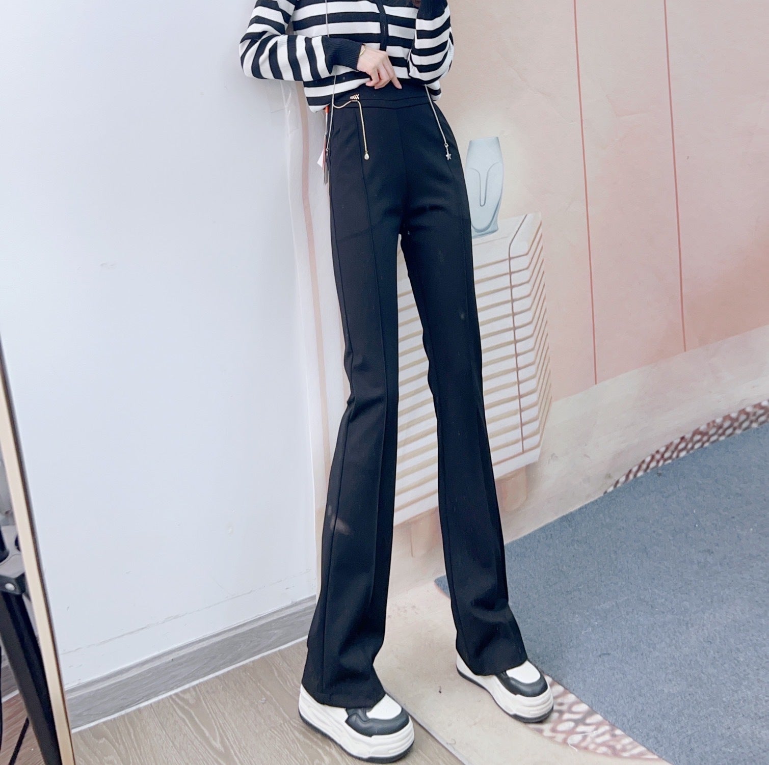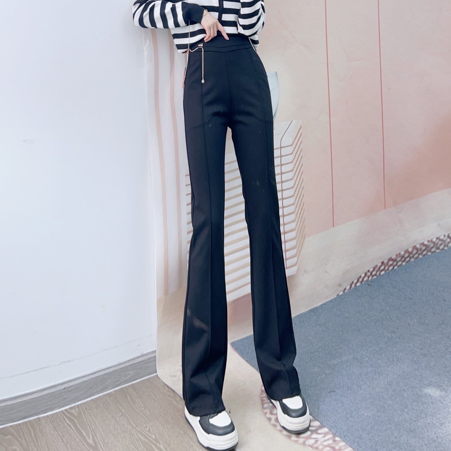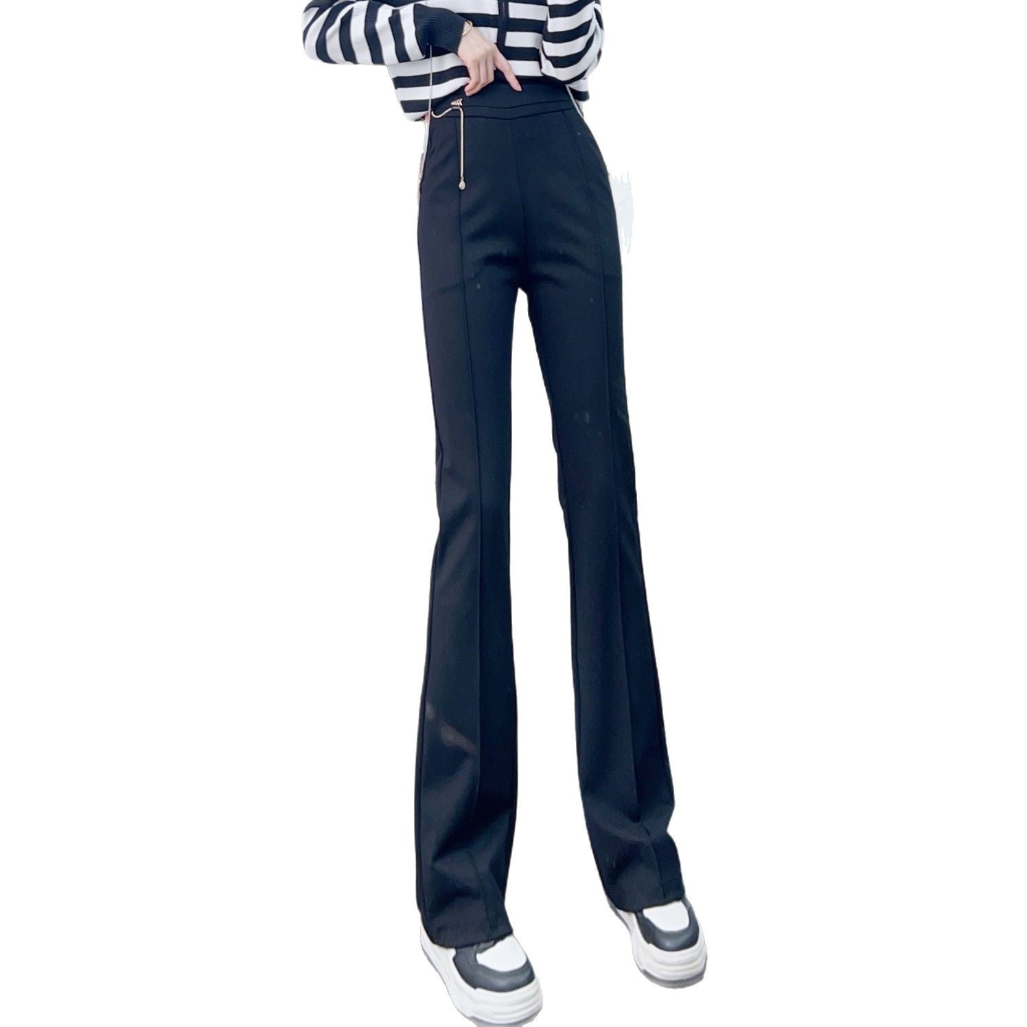 Denne stilfulde Flared-Bukser forener elegance og komfort. Fremstillet af højkvalitets, elastisk materiale, sikrer den en perfekt pasform og bevægelsesfrihed. Den høje talje fremhæver taljen og skaber en feminin silhuet, mens den innovative flared-form giver et moderne look.