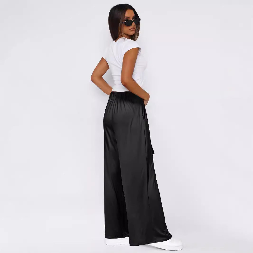 Opdag den perfekte kombination af stil og komfort med vores dames elegante højtaljede bukser med bindebælte og vidde ben fra Stilla. Disse bukser er et must-have for enhver moderne garderobe og er ideelle til forskellige lejligheder.