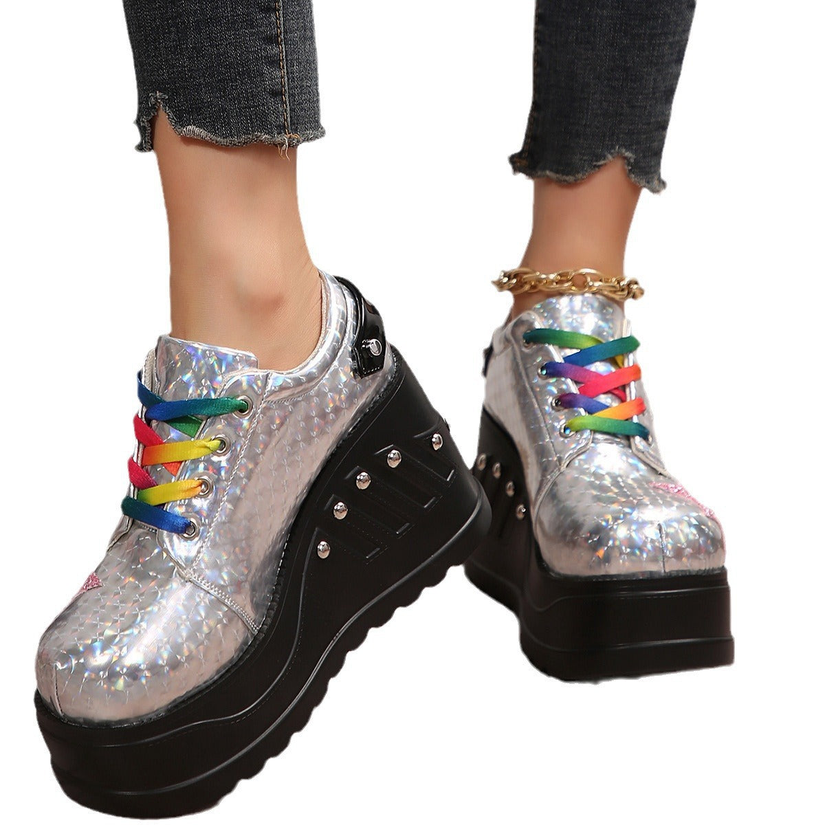 Oplev de unikke dame glitrende plateau sneakers med farverige snørebånd og glitrende stjernerapplikationer fra Stilla, der tilføjer et strejf af glamour til ethvert outfit. Disse sneakers kombinerer komfort og stil på perfekt vis.