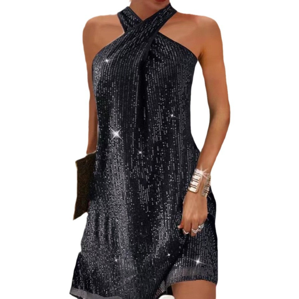 Oplev den ultimative glamour med vores dames Halterneck cocktailkjole, der er perfekt til særlige anledninger. Denne udsøgte kjole fanger med sin glitrende paillet-besætning, der sikrer en strålende optræden. Det designorienterede Halterneck-detalje fremhæver elegant din nakke og giver kjolen en feminin silhuet.