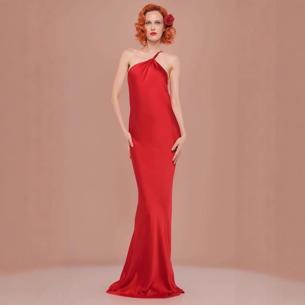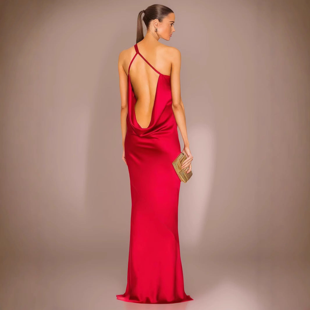 Oplev vores elegante aftenkjole til damer med asymmetrisk strop, der både indkapsler stil og raffinement. Denne kjole er lavet af høj kvalitets, luksuriøst materiale, der giver en behagelig bæreoplevelse og samtidig skaber en fantastisk silhuet.