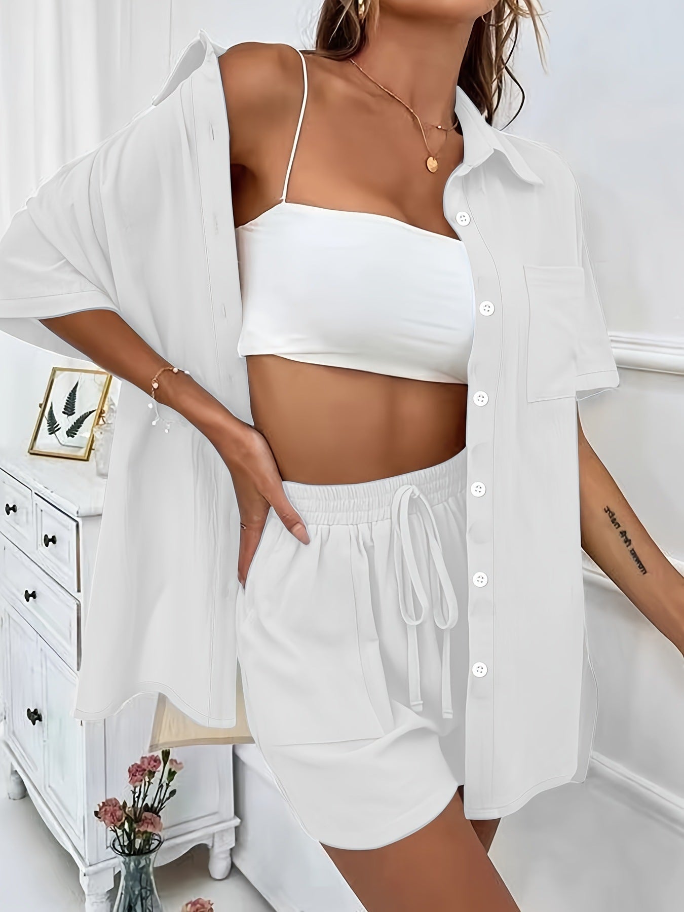 Opdag det perfekte sommeroutfit med vores dames afslappede kortærmede bluse- og shorts-sæt fra Stilla. Dette stilfulde ensemble kombinerer komfort og elegance, ideelt til afslappede dage eller udflugter i byen.