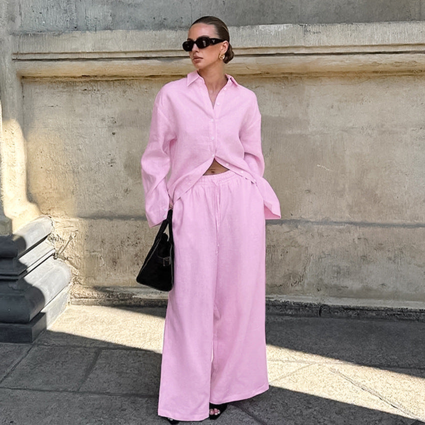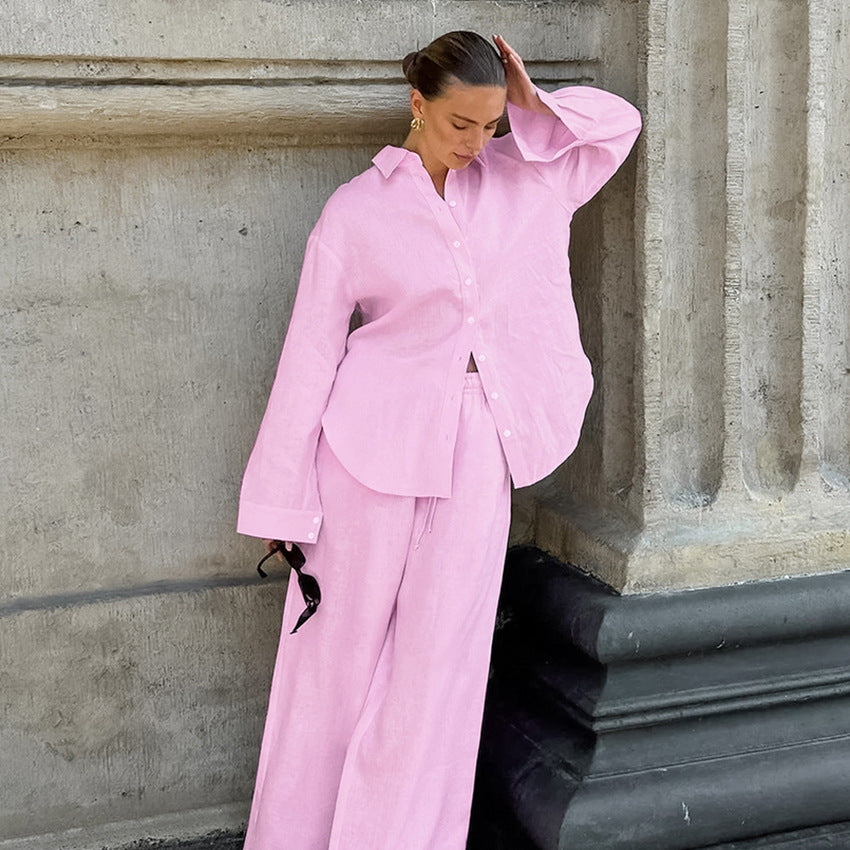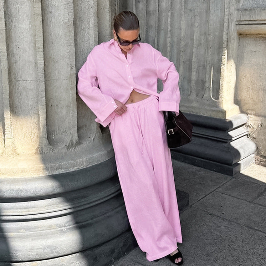 Dame linned bluser- og palazzo-bukser-sæt med løs pasform Stilla