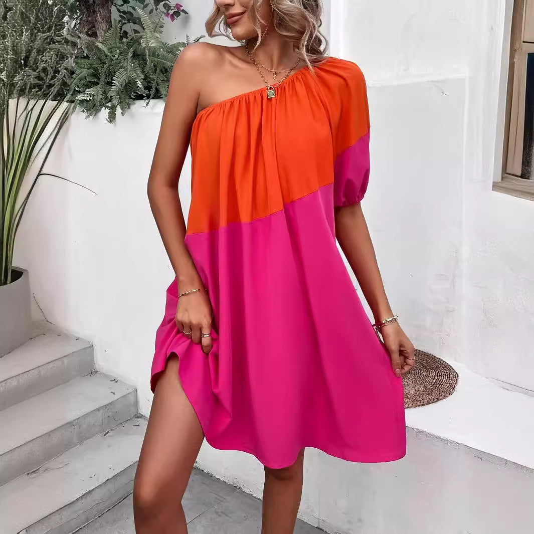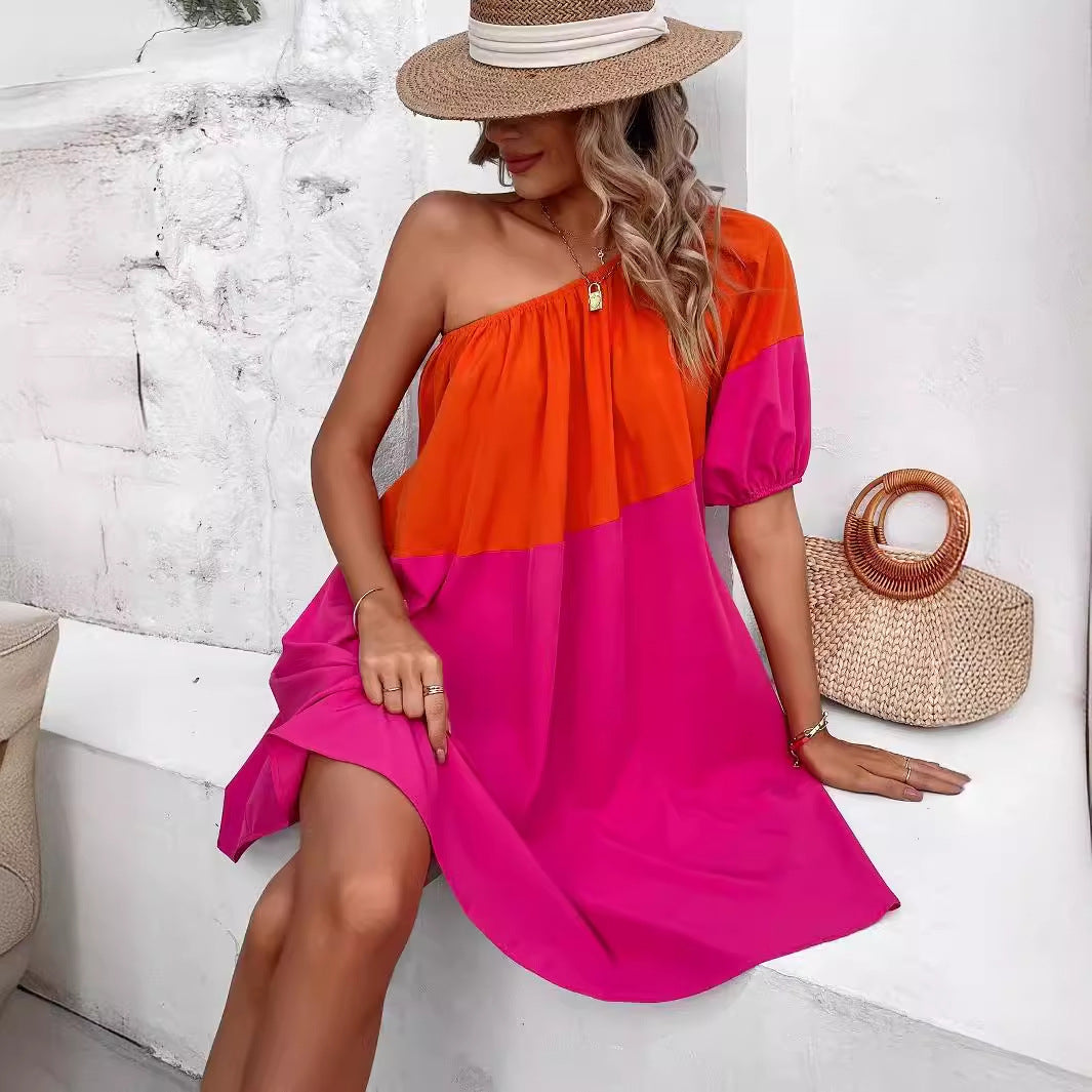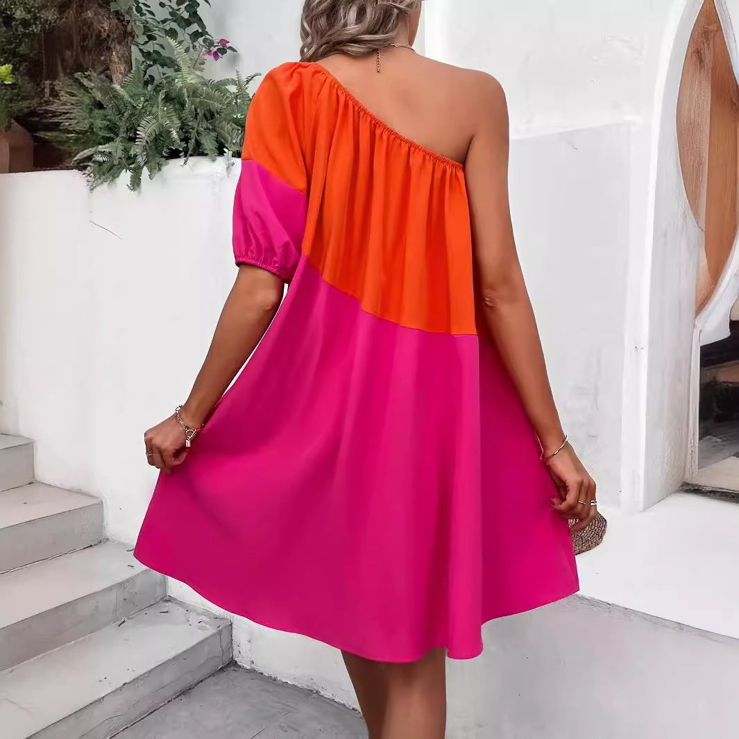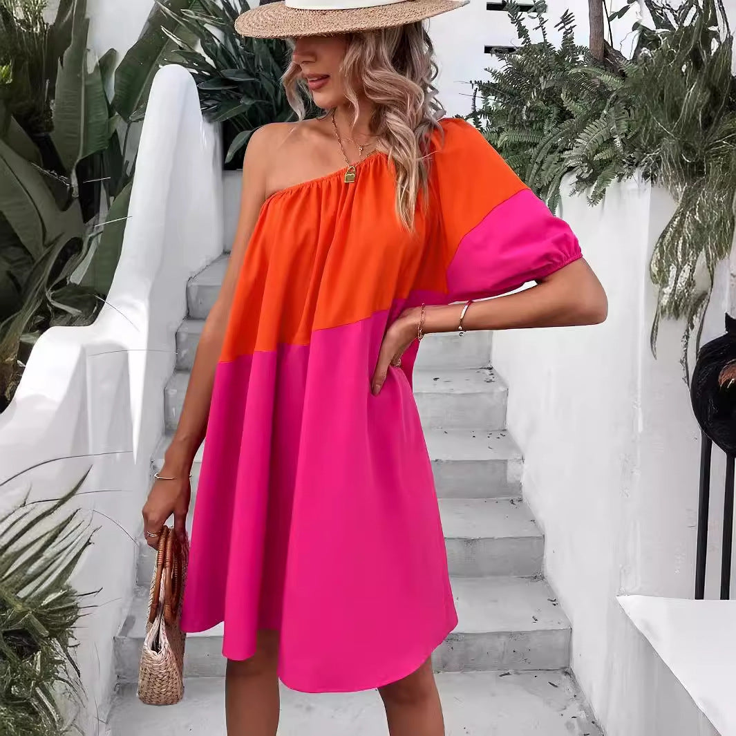 Opdag vores dames afslappede asymmetrisk sommerkjole, der imponerer med en enkelt strop og et attraktivt farverigt blokdesign. Denne kjole er ideel til de varme dage og giver dig et friskt, moderne look.