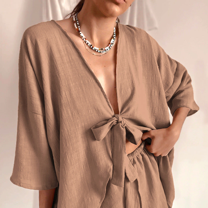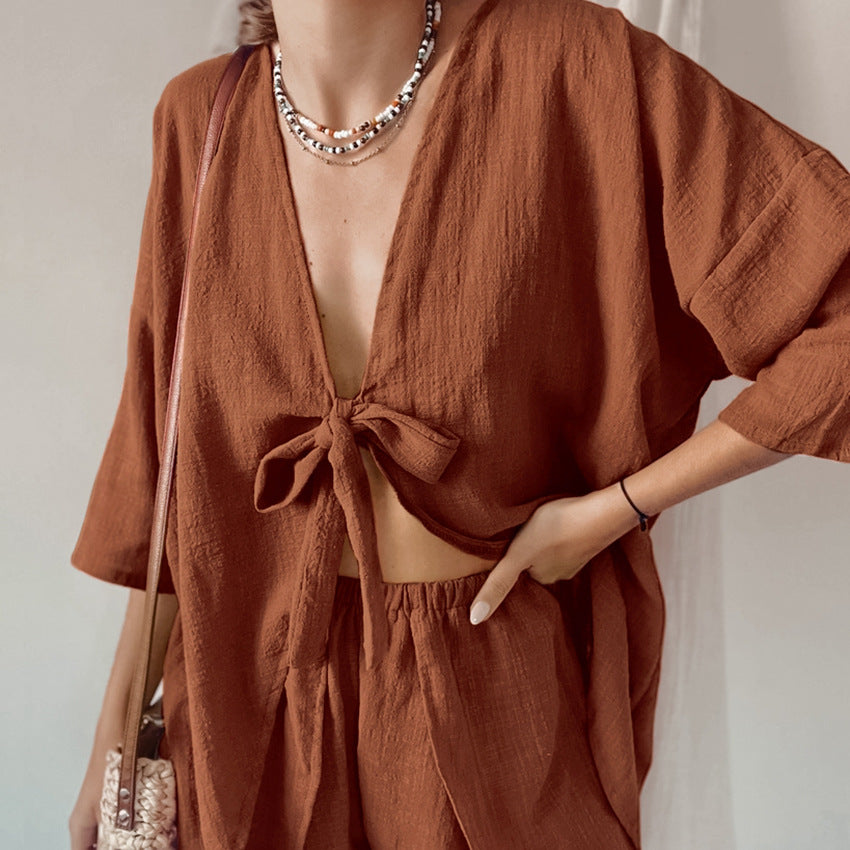 Dette stilfulde dames lounge-sæt kombinerer komfort med trendy design. Det bløde stof giver en behagelig bærekomfort og er perfekt til afslappende dage derhjemme eller når man mødes med venner.
