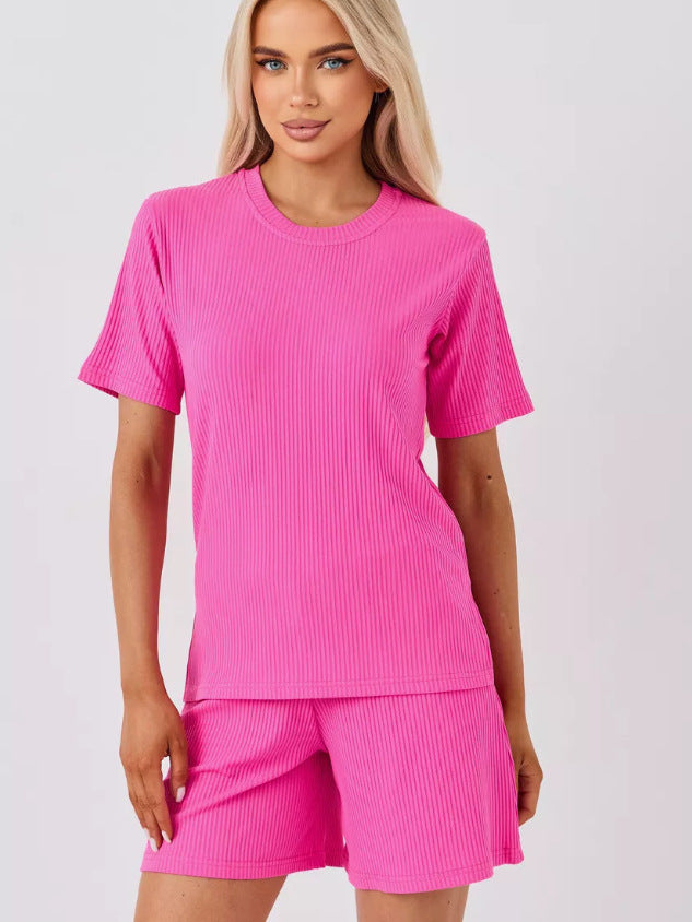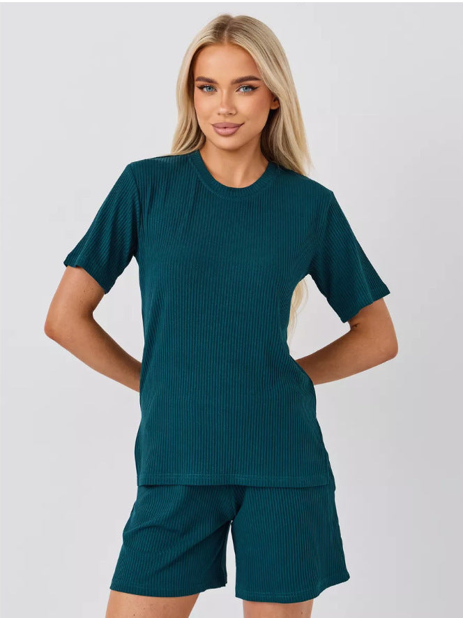 Opdag det ideelle look til afslappede dage med vores afslappede ribstrikkede sæt, bestående af en komfortabel T-shirt og et stilfuldt par shorts. Dette sæt forener mode elegance med maksimal bærekomfort.