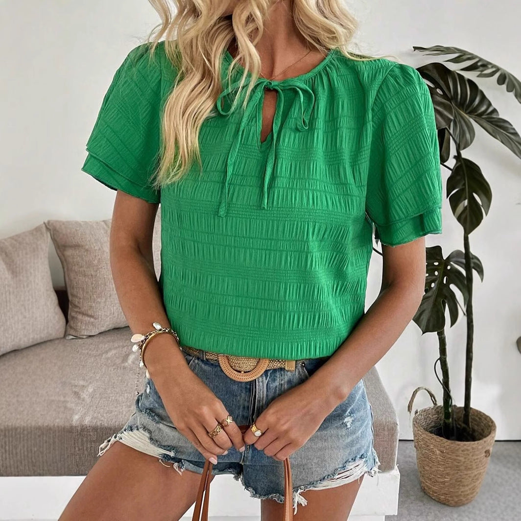 Opdag den perfekte kombination af stil og komfort med vores afslappede kortærmede bluse. Denne bluse imponerer med sit strukturerede design og de kvalitetsmaterialer, der sikrer en behagelig bæring.