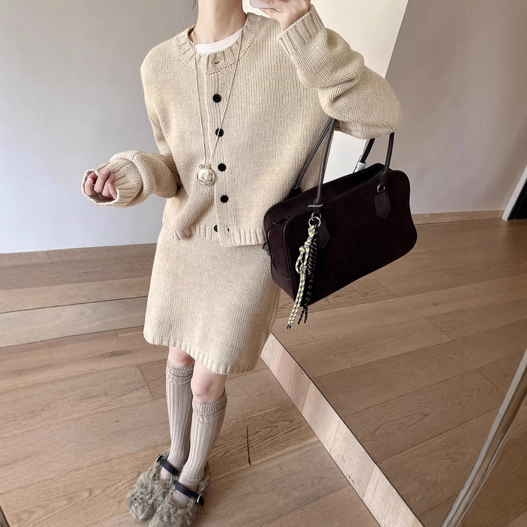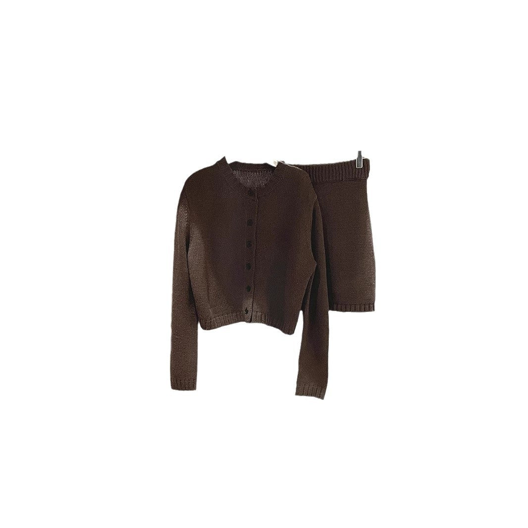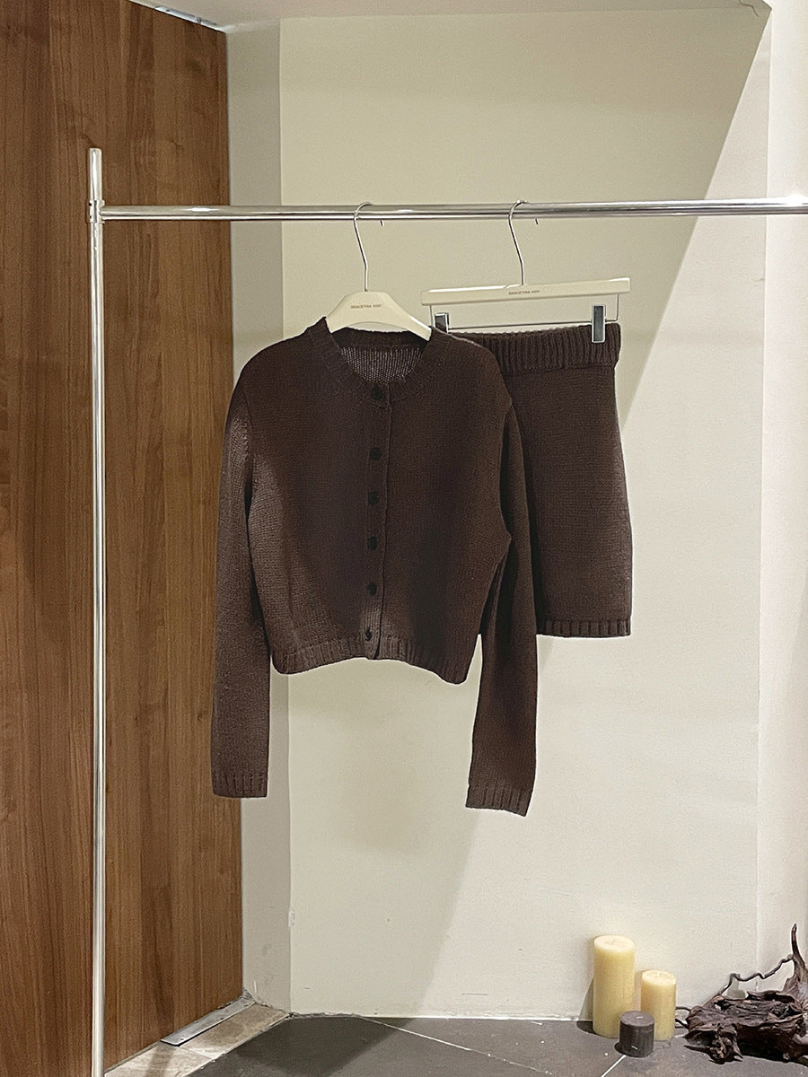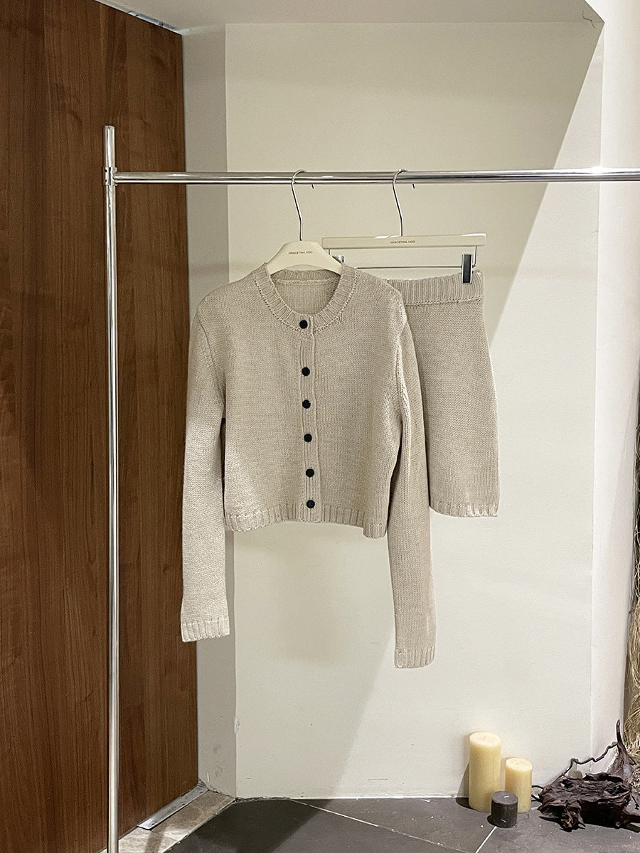 - Design: Strikjakken har en klassisk rund halsudskæring og elegante knapdetaljer, mens bukserne med elastisk talje giver den bedste pasform.