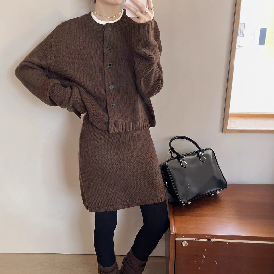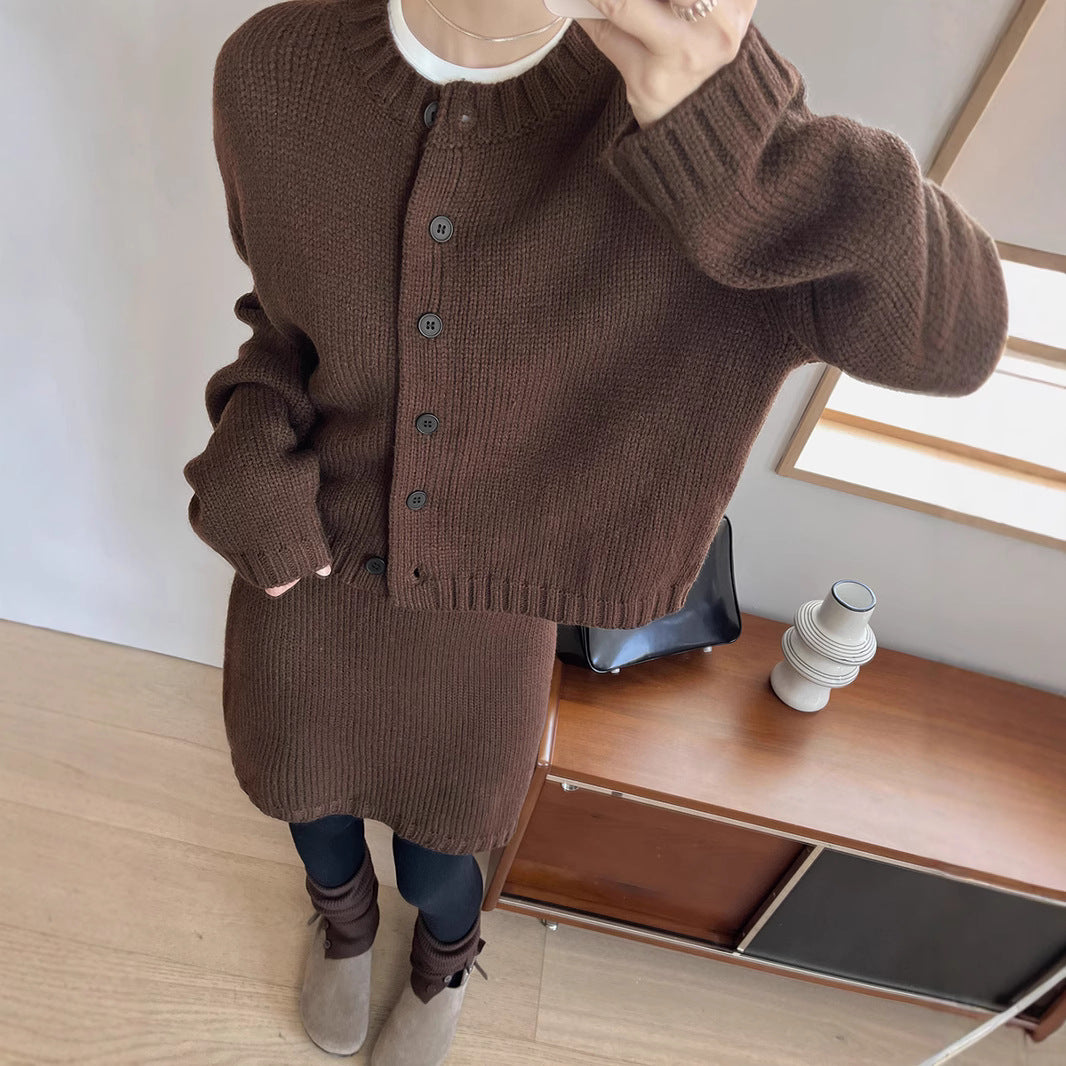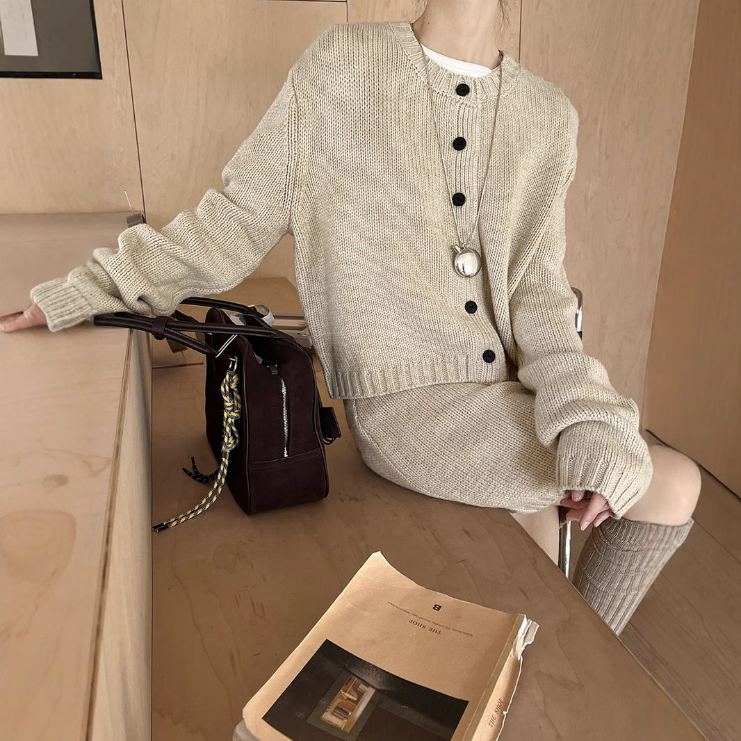 - Design: Strikjakken har en klassisk rund halsudskæring og elegante knapdetaljer, mens bukserne med elastisk talje giver den bedste pasform.