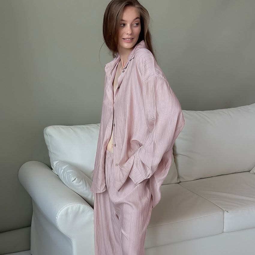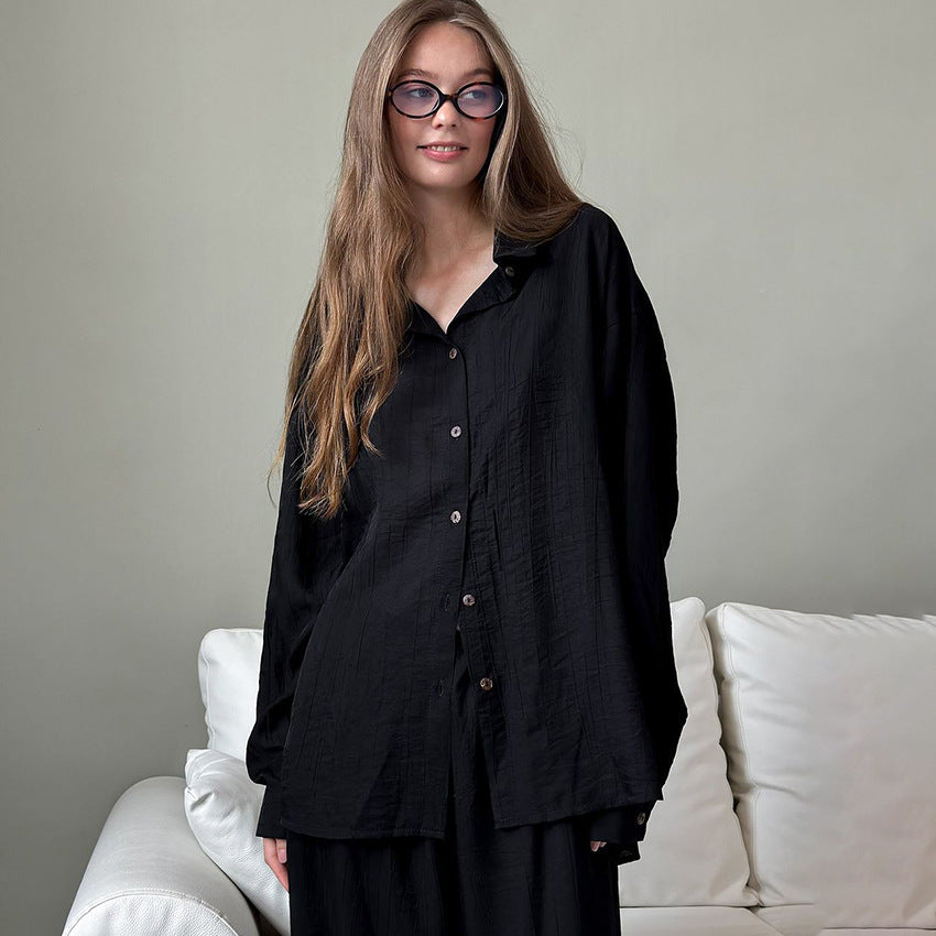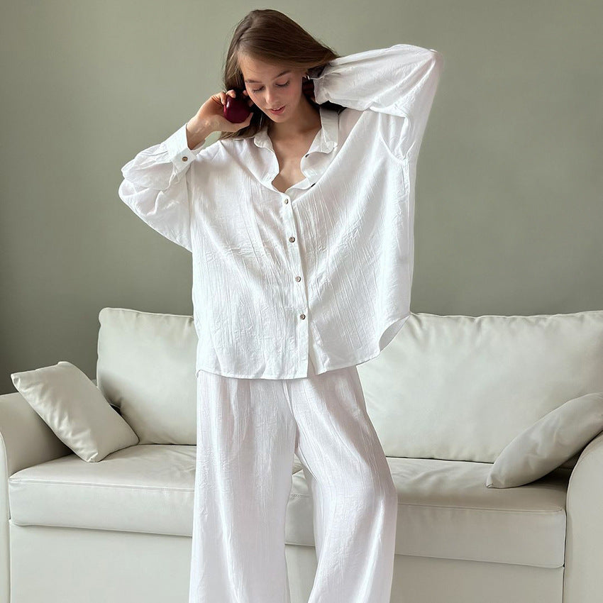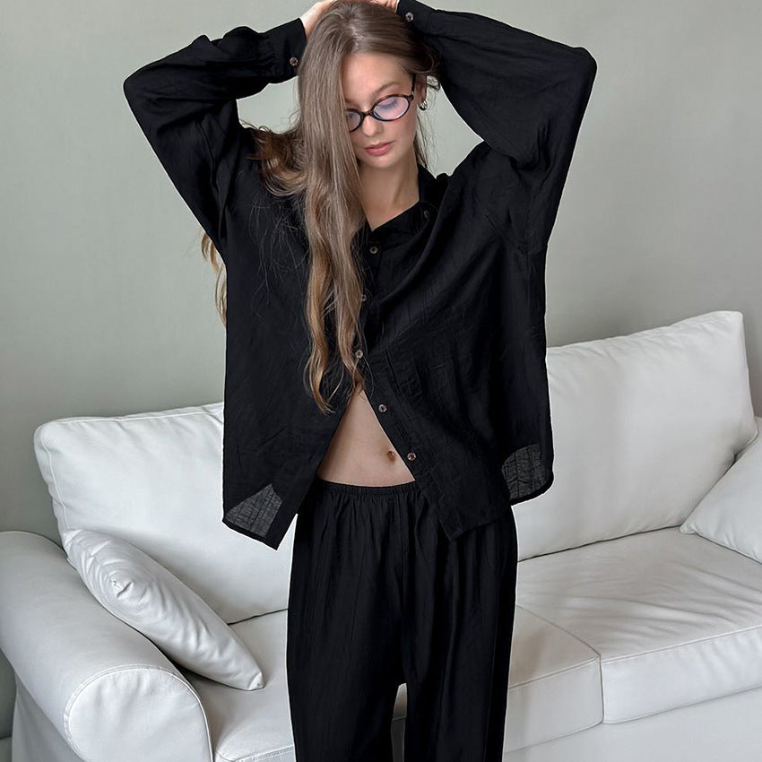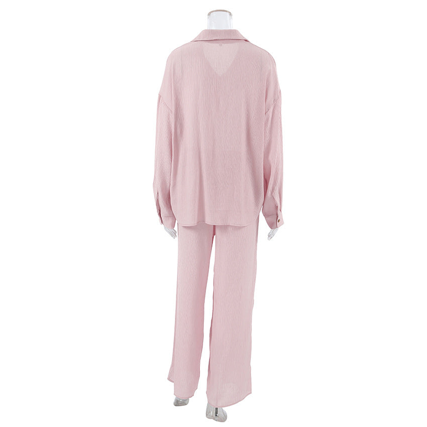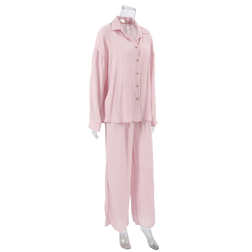 Oplev vores dames lounge-sæt, som består af en afslappet skjorte med knaplukning og et bredt par bukser. Dette sæt kombinerer stil med fremragende bærekomfort og er det perfekte valg til afslappede dage derhjemme eller uformelle udflugter.