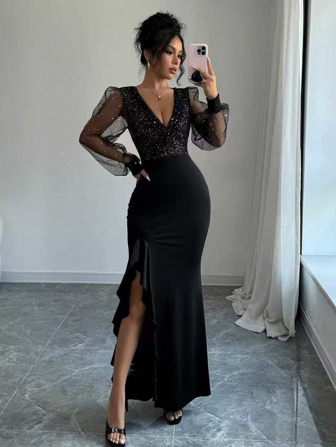 Vi præsenterer vores fascinerende, elegante aftenkjole, designet til den moderne kvinde, der elsker at stå i rampelyset. Denne drømme kjole tilbyder: