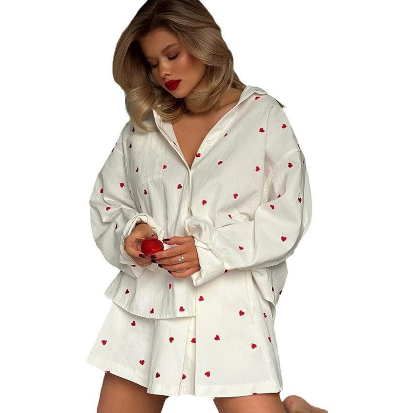 Opdag vores dames afslappede bluse- og shorts-sæt med hjerteformede accenter, der sikrer et afslappet, men stilfuldt look. Dette alsidige sæt er perfekt til de varme dage på året og tilbyder både komfort og elegance.