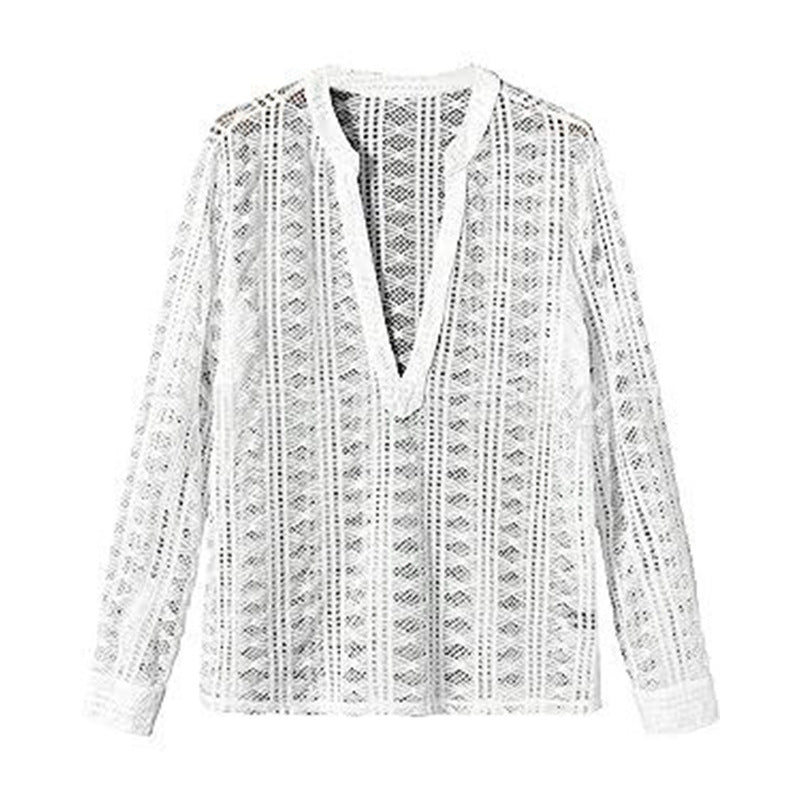 Opdag den perfekte kombination af stil og komfort med vores dame casual skjorte. Denne elegante skjorte imponerer med sit fine hæklemønster, der giver et unikt og moderne look. V-halsen sikrer en smigrende silhuet, mens den løse pasform giver optimal bevægelsesfrihed.