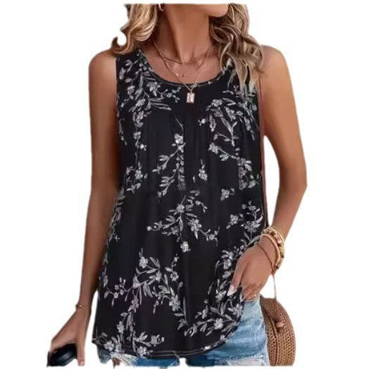 Dette fashionable dametop tilbyder den perfekte kombination af stil og komfort. Med et attraktivt blomsterdesign og en klassisk rund halsudskæring er det det ideelle valg til afslappede sommeroutfits eller casual fritidslook.