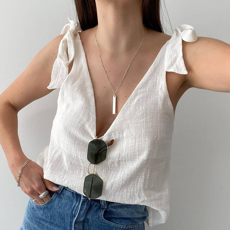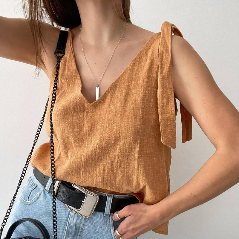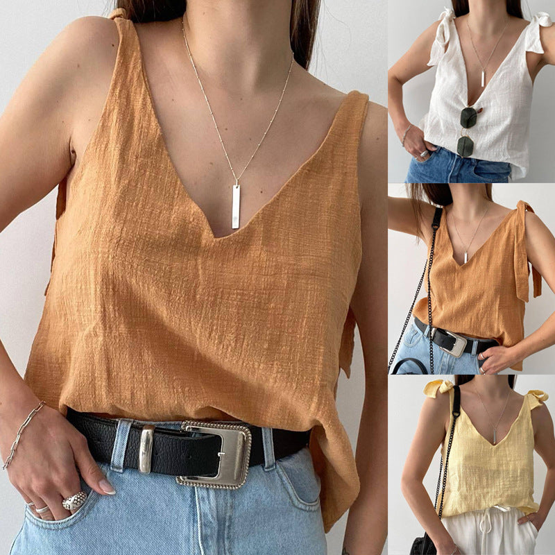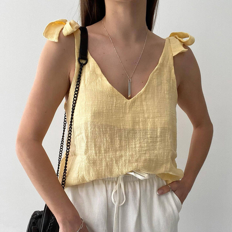 Opdag vores charmerende casual bluse-top til kvinder, som er udstyret med stilfulde sløjfe-stropper. Denne top forener elegance og komfort og er den ideelle ledsager til varme dage og afslappede fritidsaktiviteter.