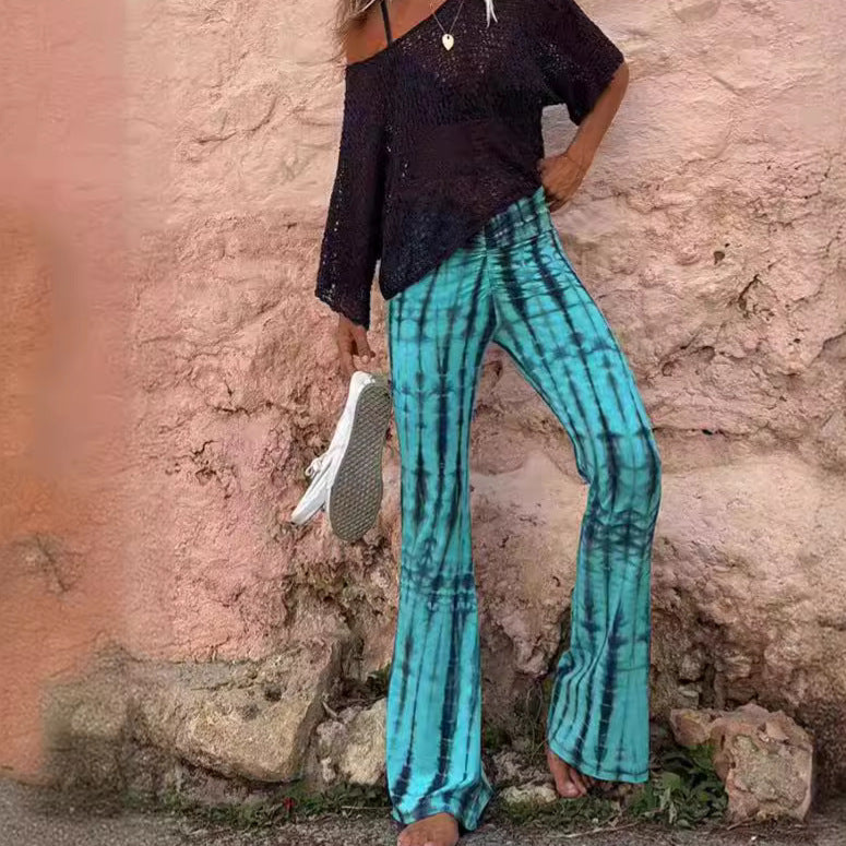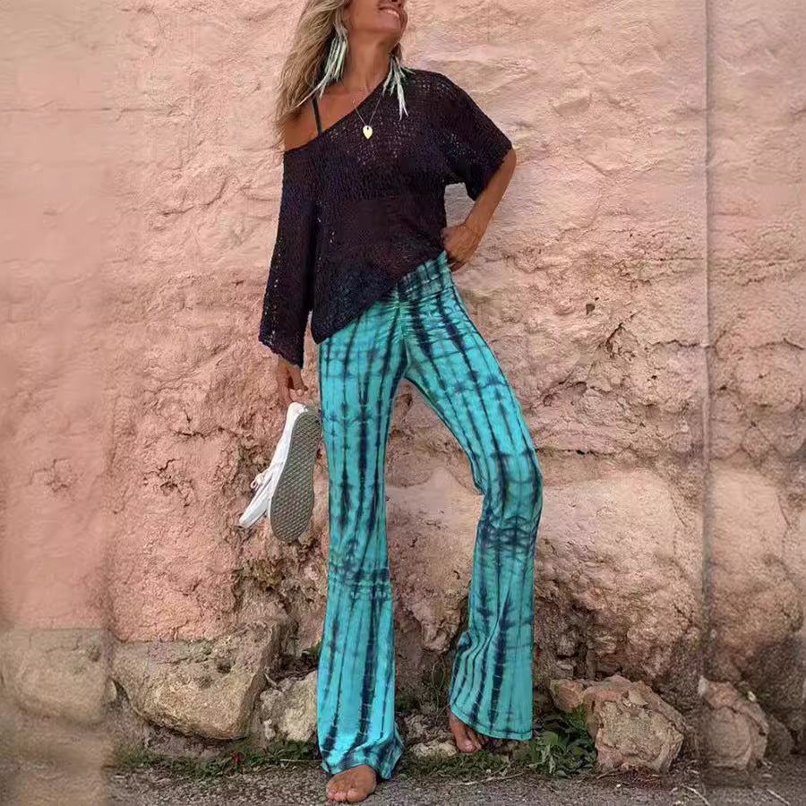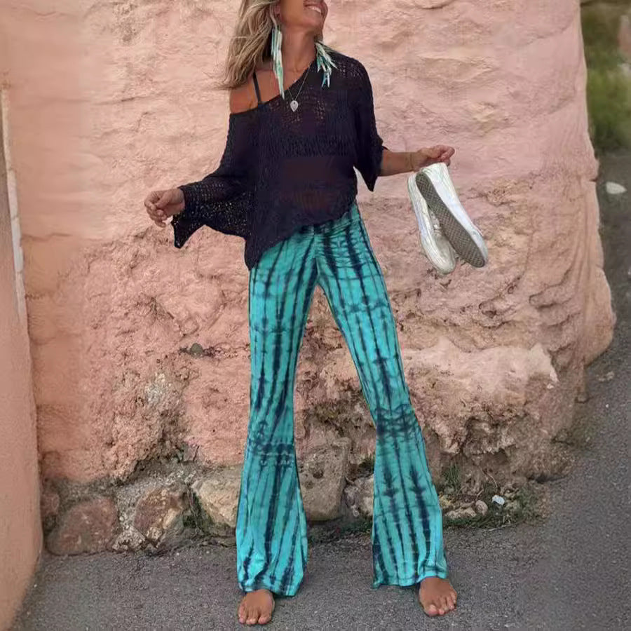 Vores trendy damers afslappede flarebukser kombinerer stil og komfort på bedste vis. Fremstillet af let og åndbart materiale, er de perfekte til varme dage og afslappede udflugter. De unikke batikmønstre giver hvert outfit et kunstnerisk præg.