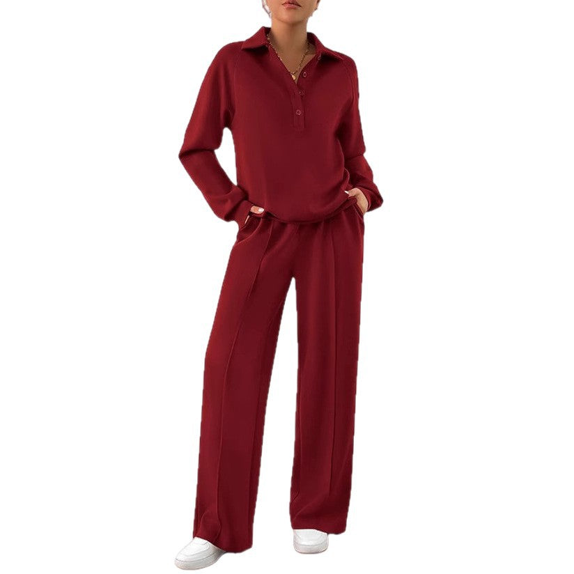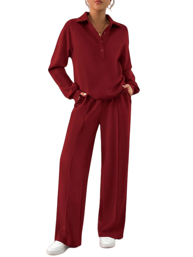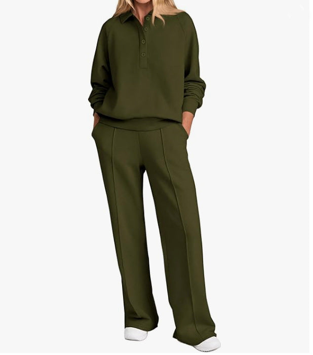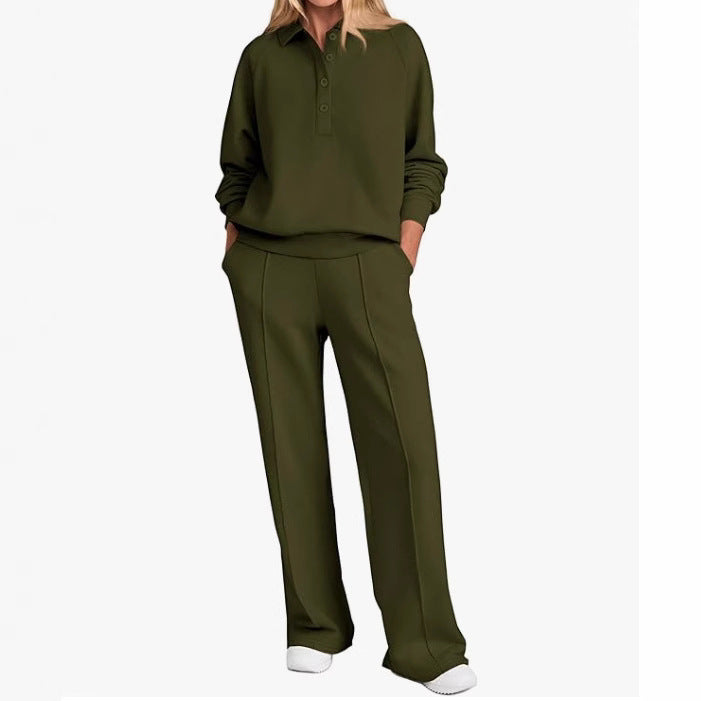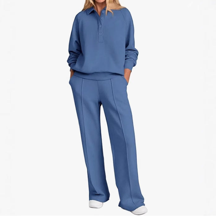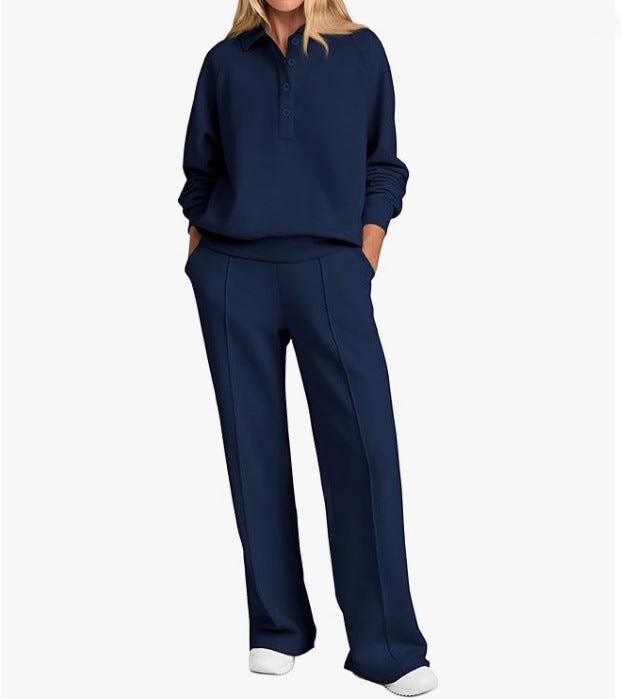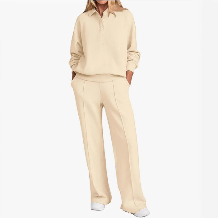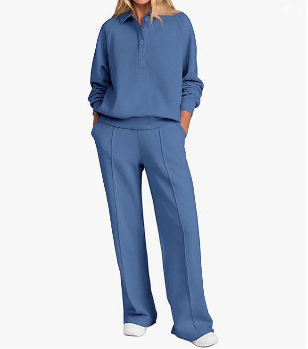 Opdag vores stilfulde og komfortable fritids-sæt til kvinder, som er perfekt til både afslappede dage derhjemme og ture i byen. Dette sæt omfatter en høj kvalitets top med klassisk krave og en afslappet pasform samt et bredt bukseben, der sikrer maksimal bevægelsesfrihed.
